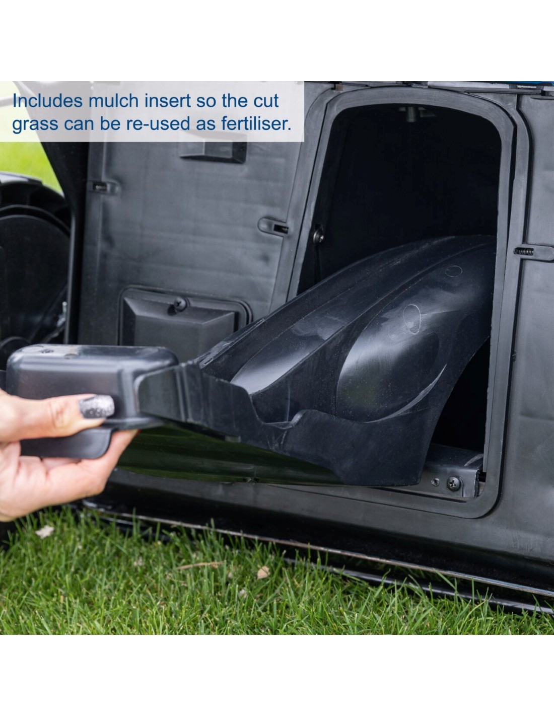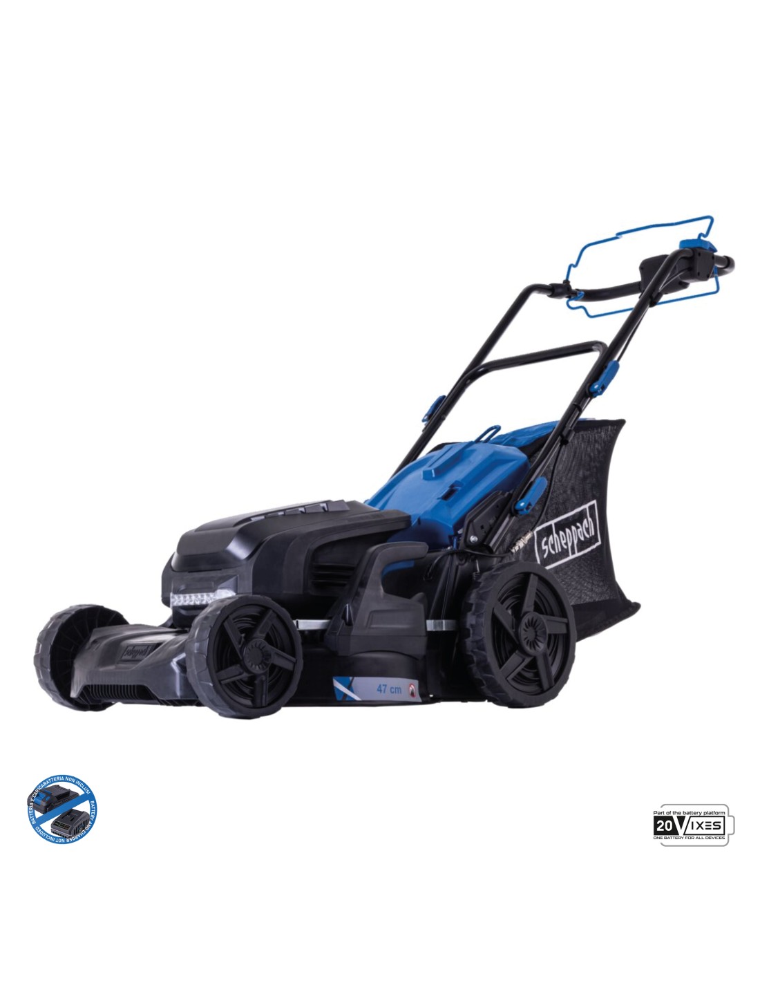 TOSAERBA A BATTERIA DA 47 CM • Tosaerba a batteria ad alte prestazioni con una larghezza di taglio di 47 cm, adatto per giardini di dimensioni 800 – 900 m2 • Motore brushless esente da manutenzione e particolarmente efficiente, con maggiore autonomia e durata e bassa usura • Lavoro a batteria con la serie Scheppach IXES 20 Volt – tutte le batterie e i caricabatterie di questa serie di sistemi possono essere combinati con il tosaerba a batteria • Potente 2x 20 V per il funzionamento e l'estensione della batteria per 2 batterie aggiuntive • Regolazione centrale dell'altezza di taglio • L'impugnatura ergonomica assorbe le vibrazioni • Vario drive – la trazione posteriore con velocità regolabile da 2,5 a 4,5 km/h facilita la falciatura su terreni accidentati • Ampio contenitore di raccolta da 75 L con indicatore del livello di riempimento • I fari a LED consentono di lavorare al crepuscolo o in condizioni di scarsa illuminazione • Robusto alloggiamento in acciaio con maniglia di trasporto integrata per garantire un facile trasporto • Vano batteria con cappuccio protettivo pieghevole • Lucidato lama in acciaio speciale - particolarmente robusta e durevole - Ruote alte - le grandi ruote che sono delicate sul prato garantiscono una presa sicura anche su terreni ripidi - Maniglia di prua pieghevole e regolabile in altezza per uno stoccaggio salvaspazio e una postura di lavoro ergonomica - Espulsione integrata sul lato e sul retro, nonché funzione di pacciamatura per un risultato professionale - Batteria e caricabatterie disponibili separatamente