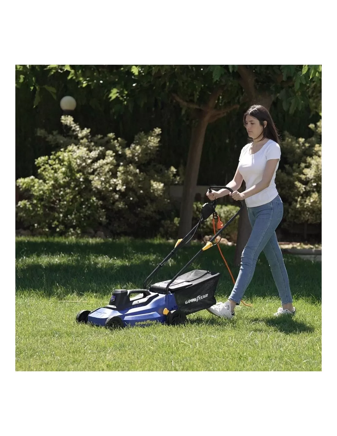 Questo tosaerba elettrico Goodyear da 1800 W incorpora un motore elettrico da 210-230 V in grado di raggiungere una velocità di rotazione di taglio di 3.200 giri/min.