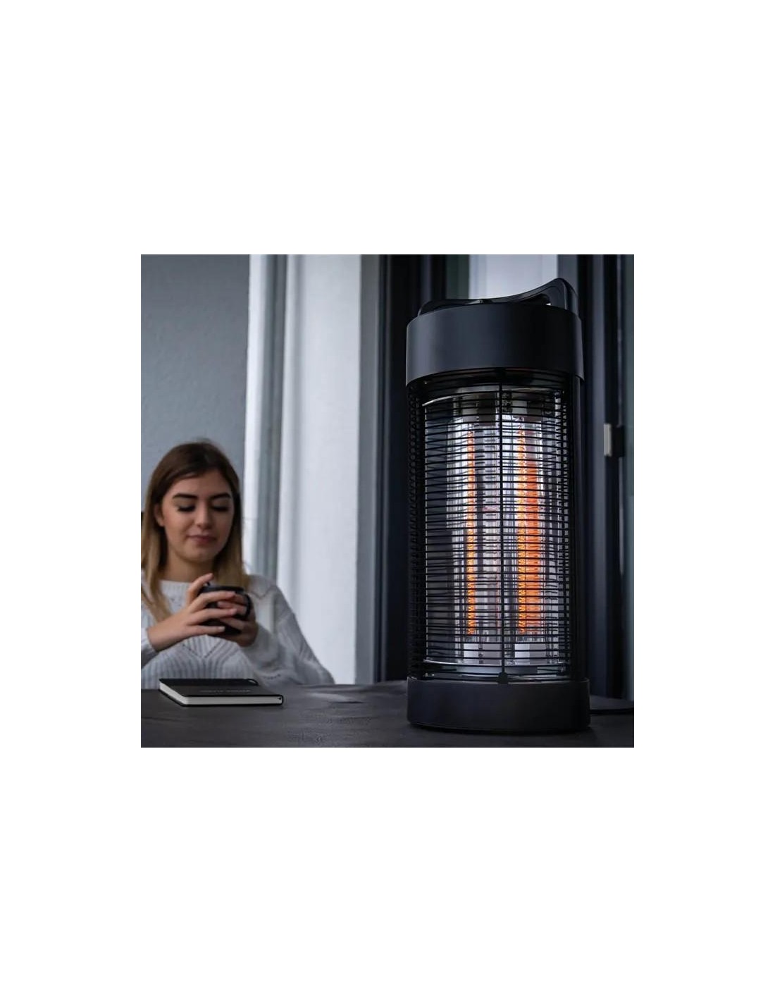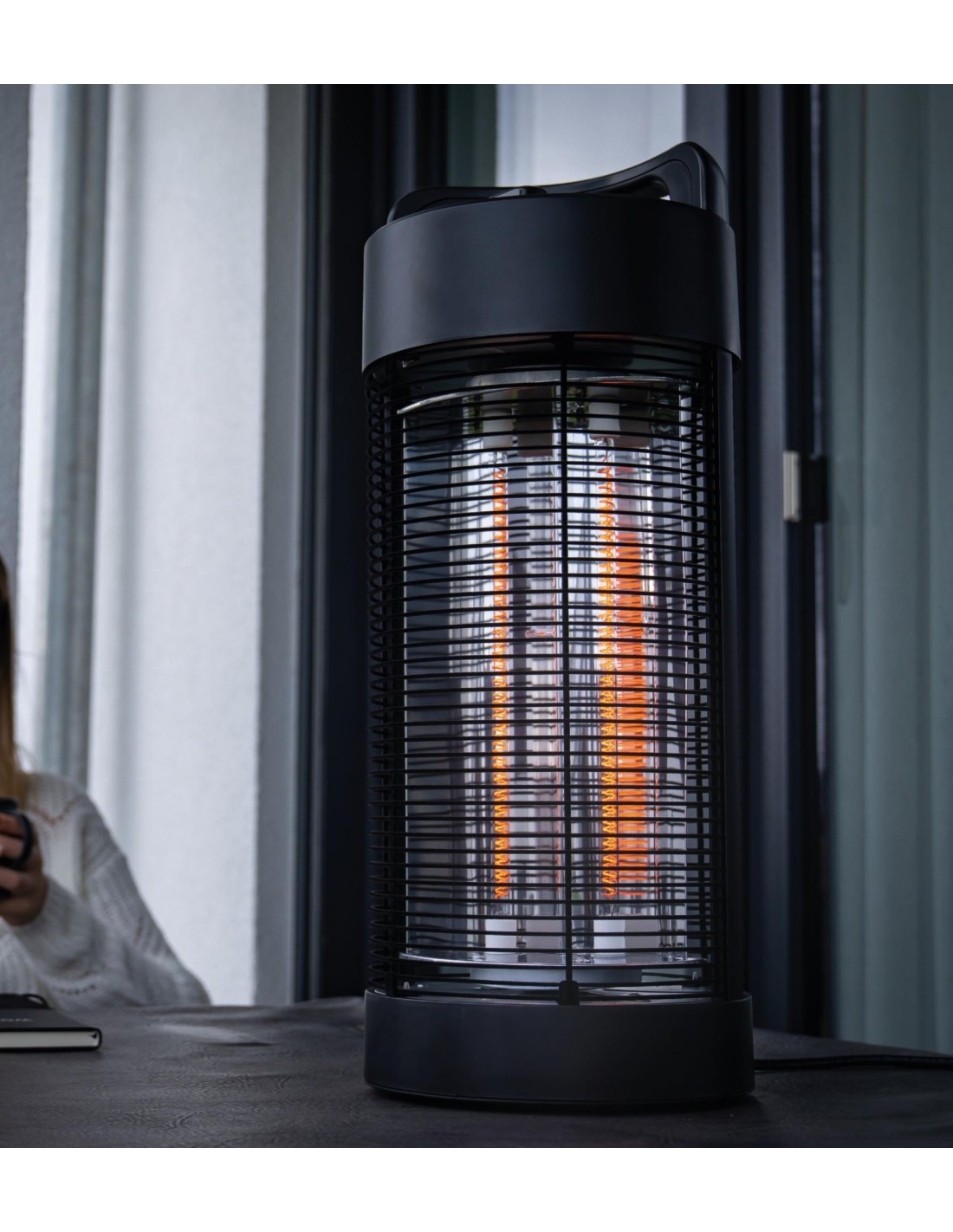 La torre di riscaldamento alta 56 cm ha un piacevole design in tinta unita nera e riscalda in modo completamente silenzioso.
