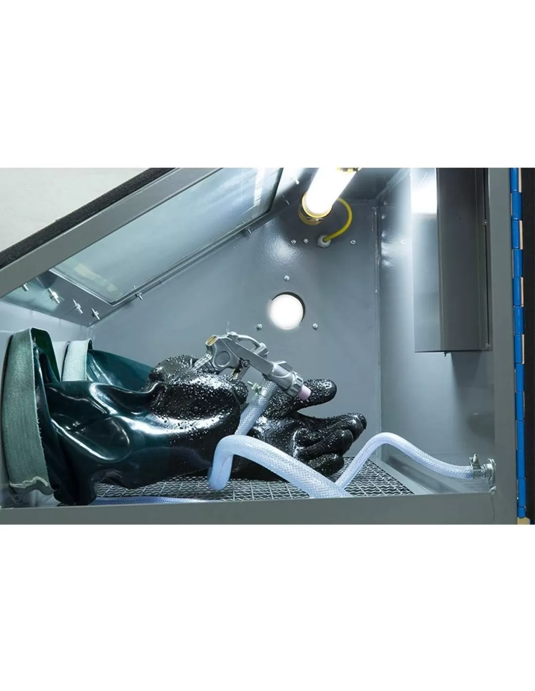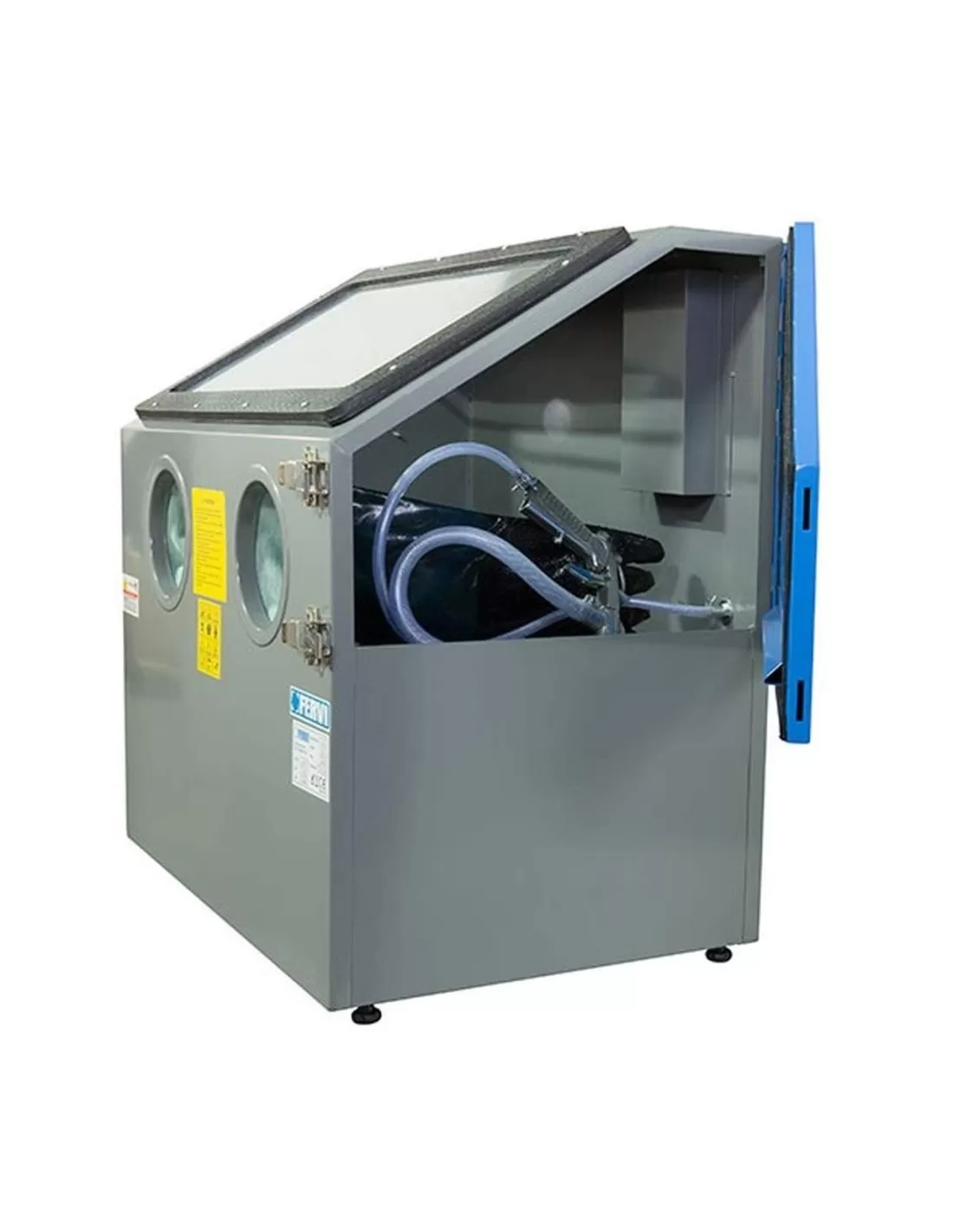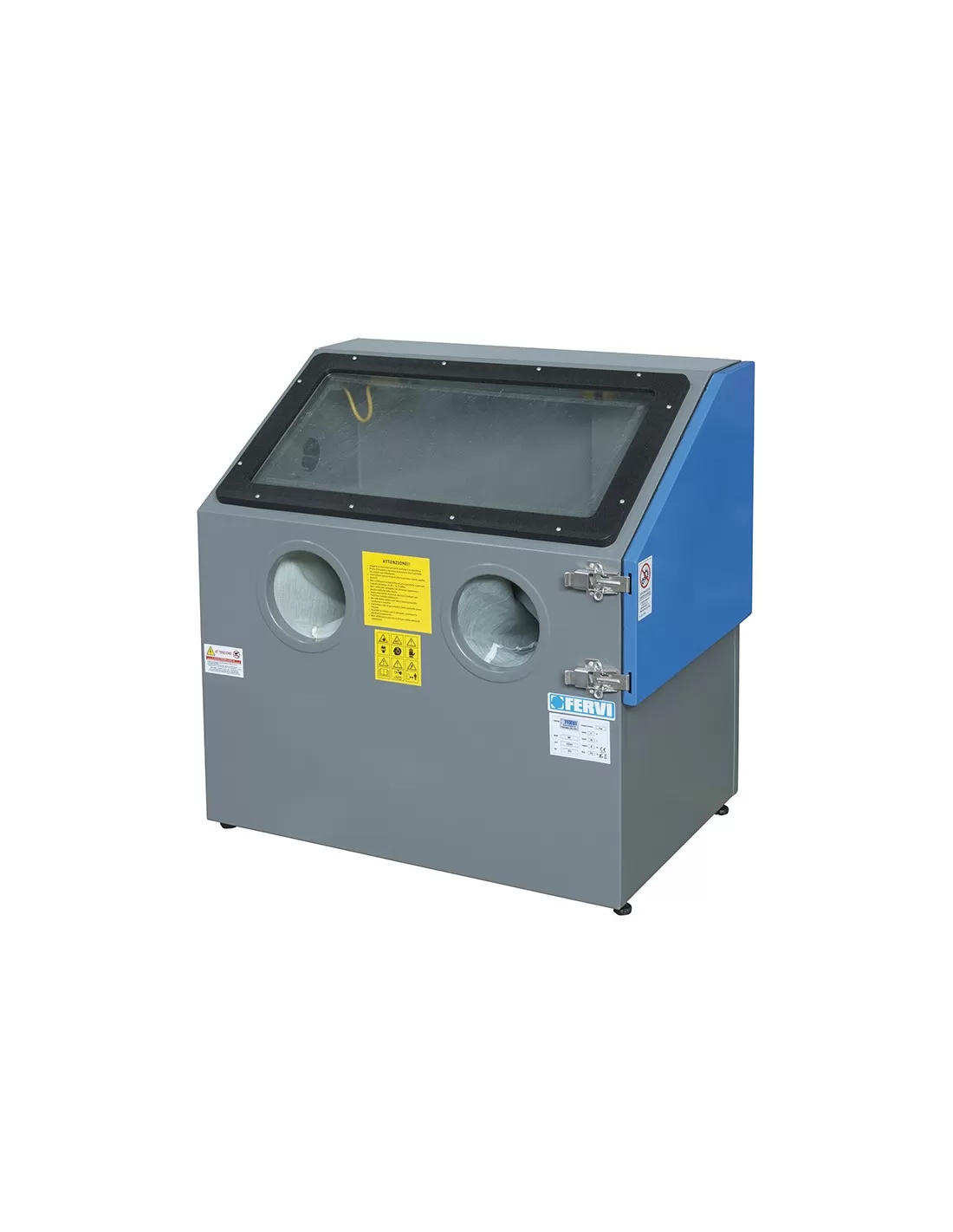 Sabbiatrice da banco Fervi 0487, con apertura laterale, pistola mobile e illuminazione.