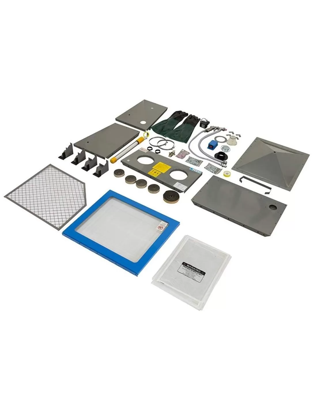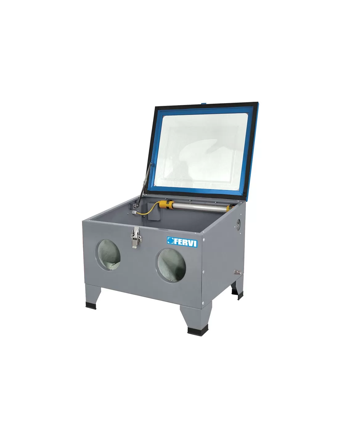 Fornita smontata, con adattatore per collegare un aspirapolvere alla macchina per evitare continui e fastidiosi fermi macchina dovuti, all'impossibilita' di vedere il pezzo che si sta sabbiando, per la troppa polvere in sospensione all'interno della sabbiatrice, ampia porta superiore, illuminazine con lampada a basso consumo, pistola per sabbiare e guanti
