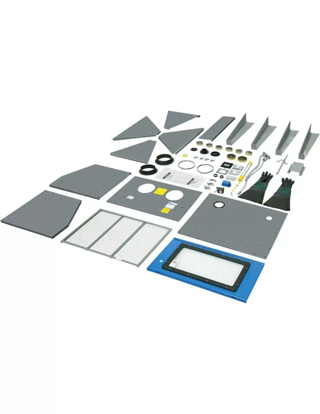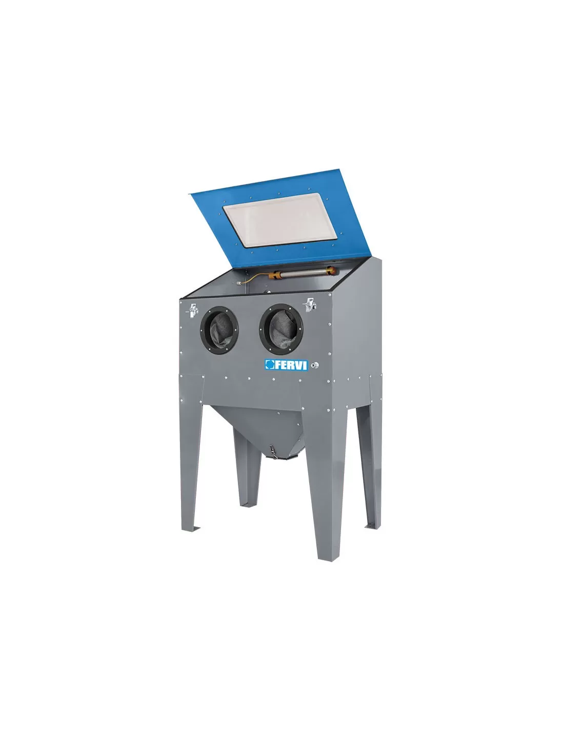 Fornita smontata, con predisposizione per il collegamento di un aspirapolvere alla macchina per evitare continui e fastidiosi fermi macchina dovuti all'impossibilita' di vedere il pezzo che si sta sabbiando, per la troppa polvere in sospensione all'interno della sabbiatrice, ampia porta superiore, illuminazine con lampada a basso consumo, pistola per sabbiare e guanti.