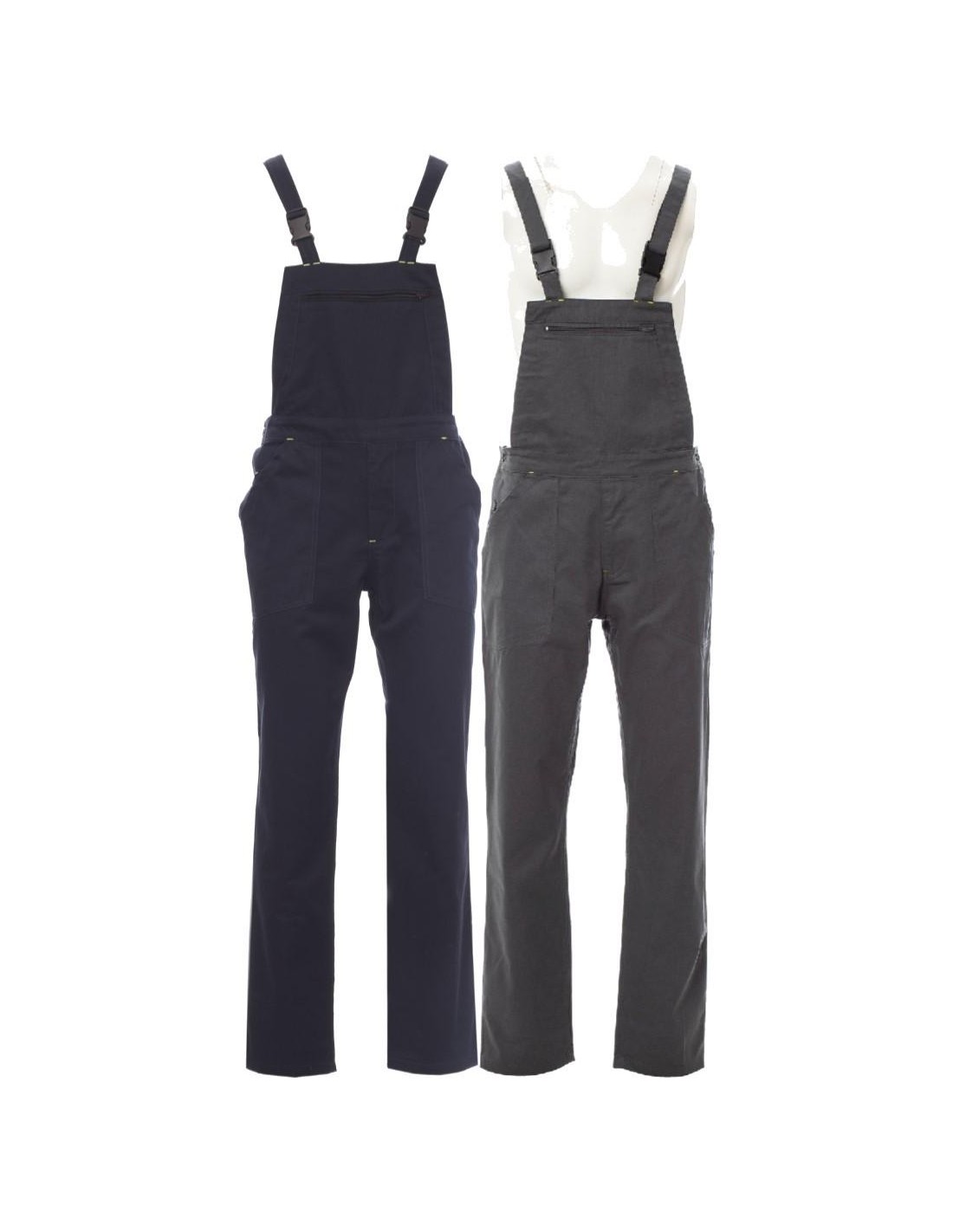 Pettorina con ampia protezione renale, bretelle elasticizzate e fibbia con chiusura automatica, apertura laterale con bottoni e chiusura della patta con zip, elastico in vita. Cucitura cavallo e interno gamba a doppio ago. Tasca al petto con porta badge e chiusura con zip, due tasche frontali e tasca porta penna, tasca porta metro laterale dx e una tasca posteriore con patta di chiusura e velcro.