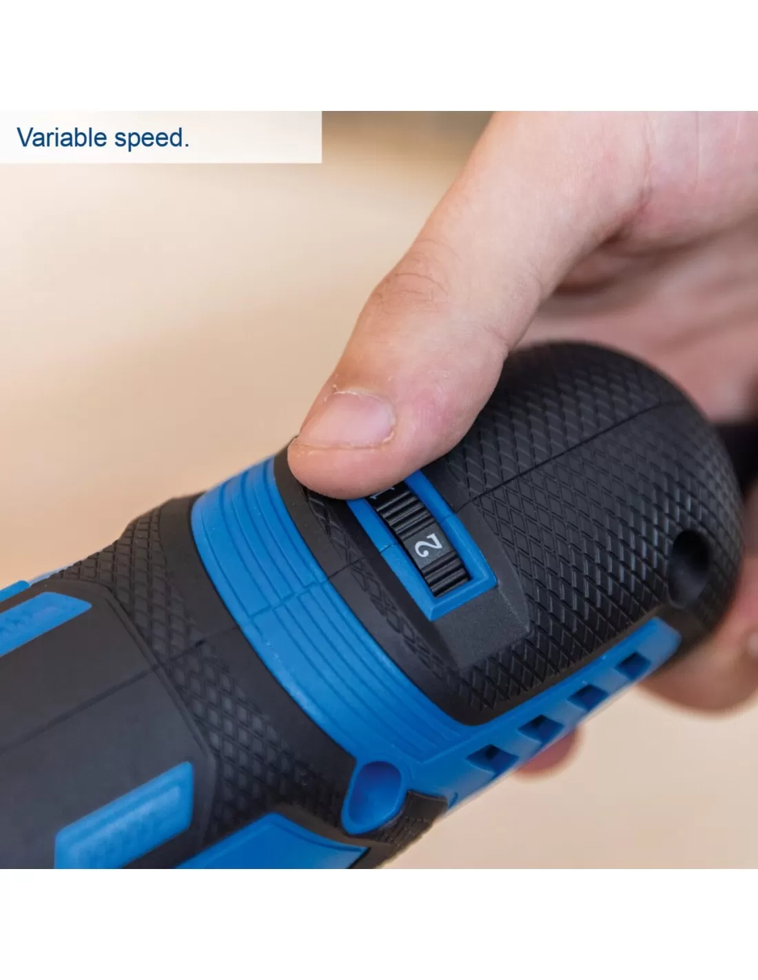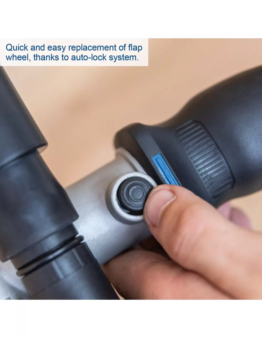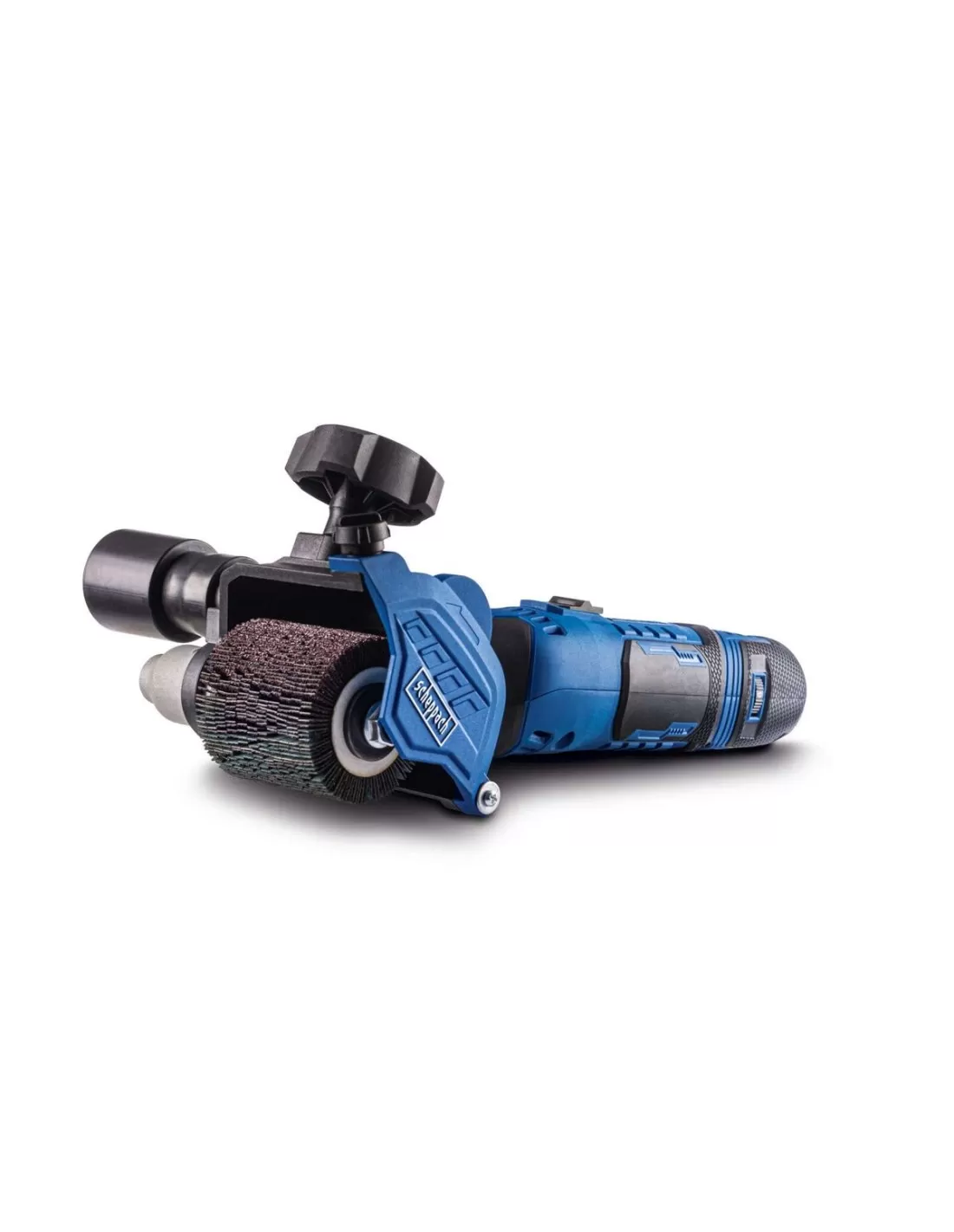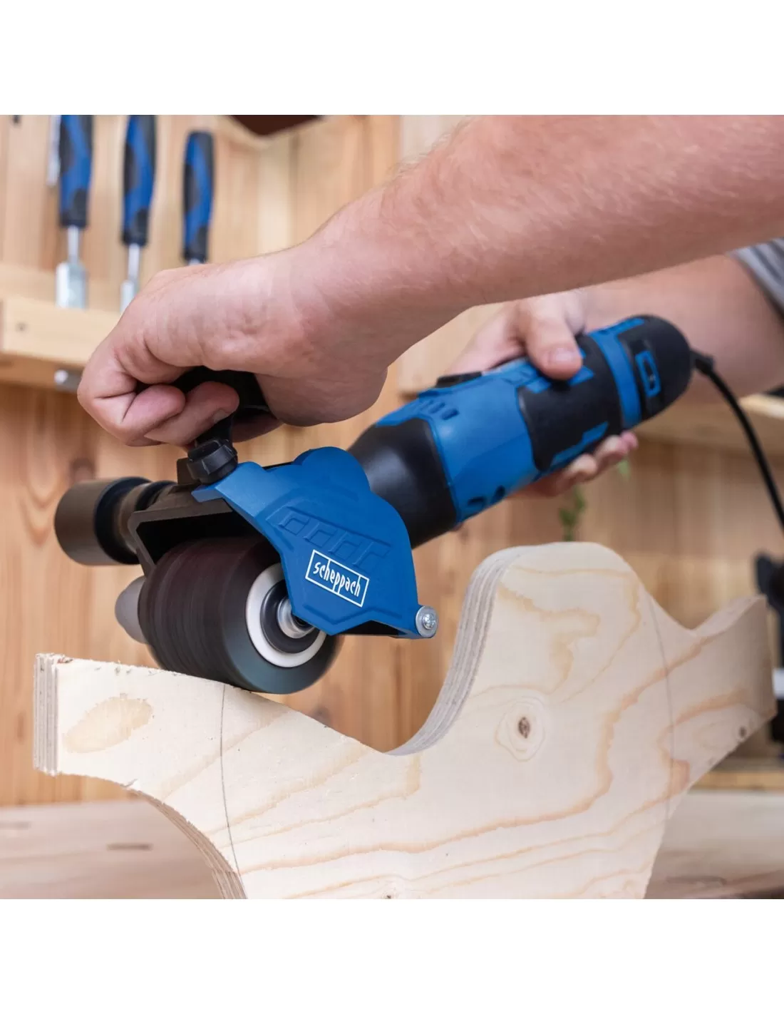 UTENSILE UNIVERSALE PER LEVIGATURA E LEVIGATURA - Per la levigatura di aree di difficile accesso, per legni strutturati, curvi o profilati, nonché per la sbavatura del metallo o la rimozione della ruggine - Sostituzione rapida e semplice della ruota lamellare, grazie al sistema di bloccaggio automatico - Potente motore da 300 W - Il design ergonomico con impugnatura morbida garantisce un uso confortevole e una guida sicura - Larghezza della spazzola 10 mm / 60 mm - La velocità regolabile da 1600 a 3200 giri/min consente un funzionamento adatto al materiale e all'applicazione - Attacco integrato per l'aspirazione esterna della polvere • Sono disponibili come accessori ulteriori per spazzole per diverse esigenze