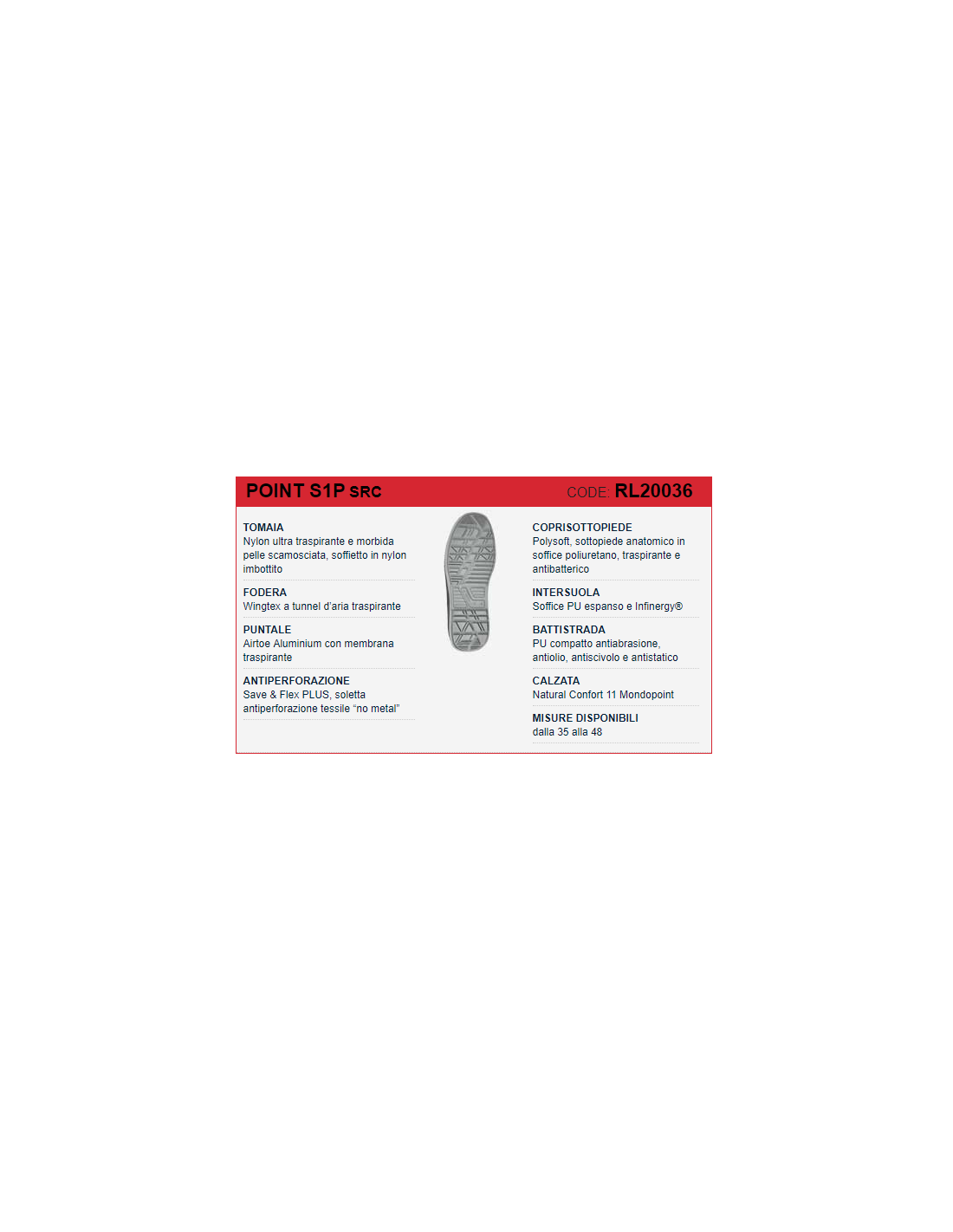 BATTISTRADA/SUOLA: PU compatto antiabrasione, antiolio, antiscivolo e antistatico