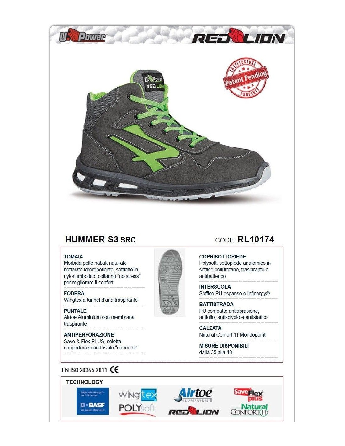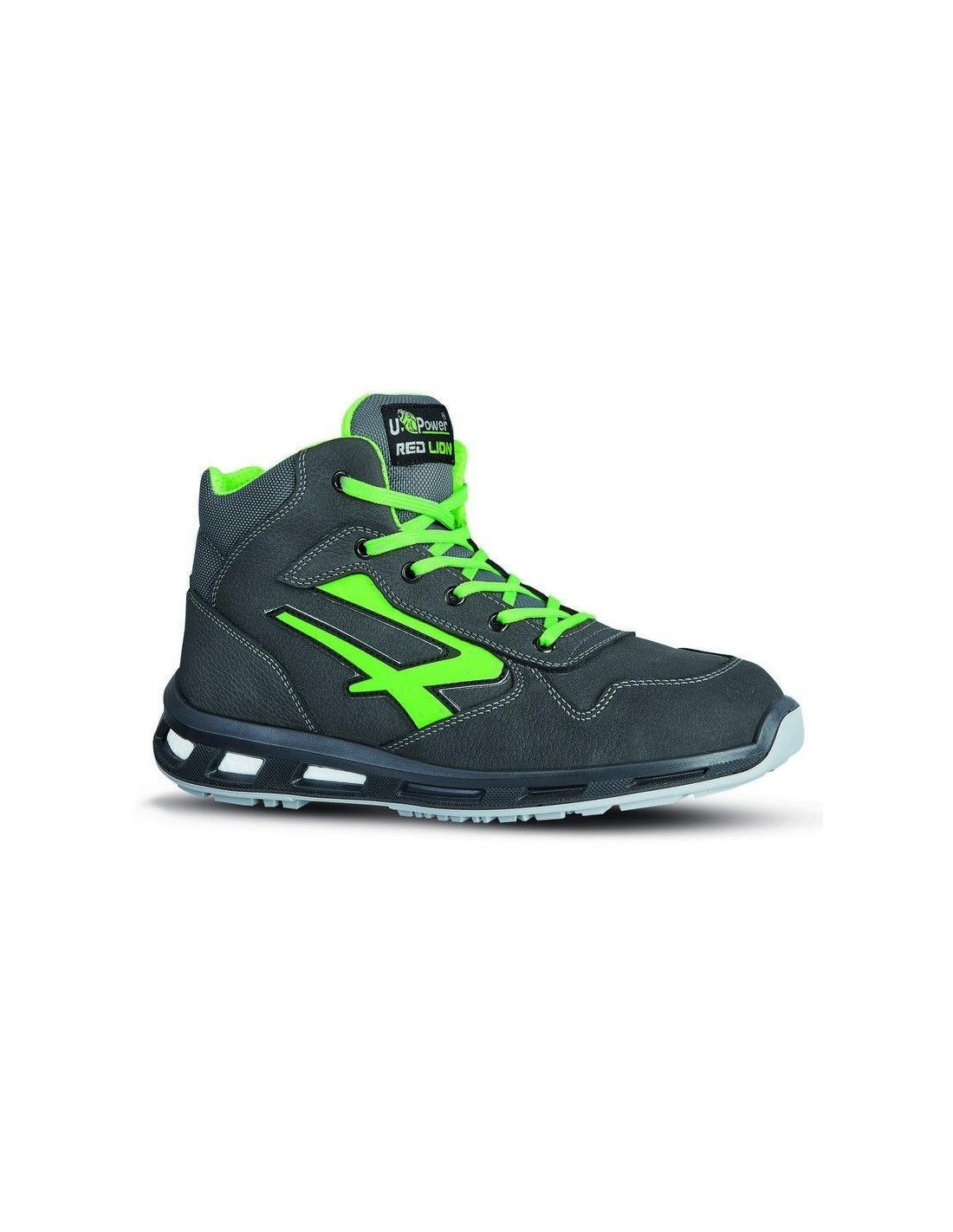 Scarpe antinfortunistiche alte, leggere e comode u power della linea Red Lion, con tomaia in pelle nabuk naturale bottalato, traspiranti, idrorepellente, puntale in alluminio, antiperforazione, antiscivolo e suola PU/PU, infinergy S3 SRC CI ESD