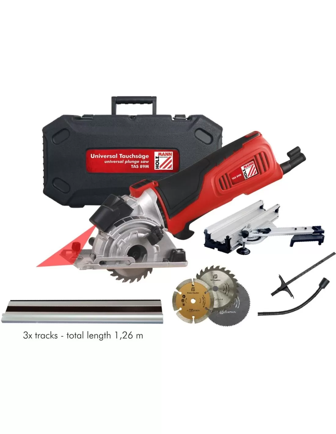 Incluso in confezione: 1 disco diamantato, 1 disco TCT, 1 disco HSS, 3 barre guida (lunghezza totale 1,26 m), base per sega completa di goniometro, adattatore per aspirazione polveri, valigia per il trasporto.