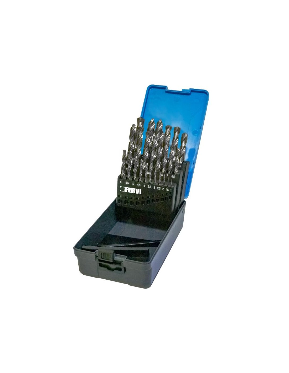 DIN 338/N, Destra, rettificata Materiale di produzione acciaio super rapido (HSS). La cima delle punte è affilata con un angolo 135°. Gli utensili, in totale 25 pezzi, vengono forniti in una scatola compatta e resistente.
