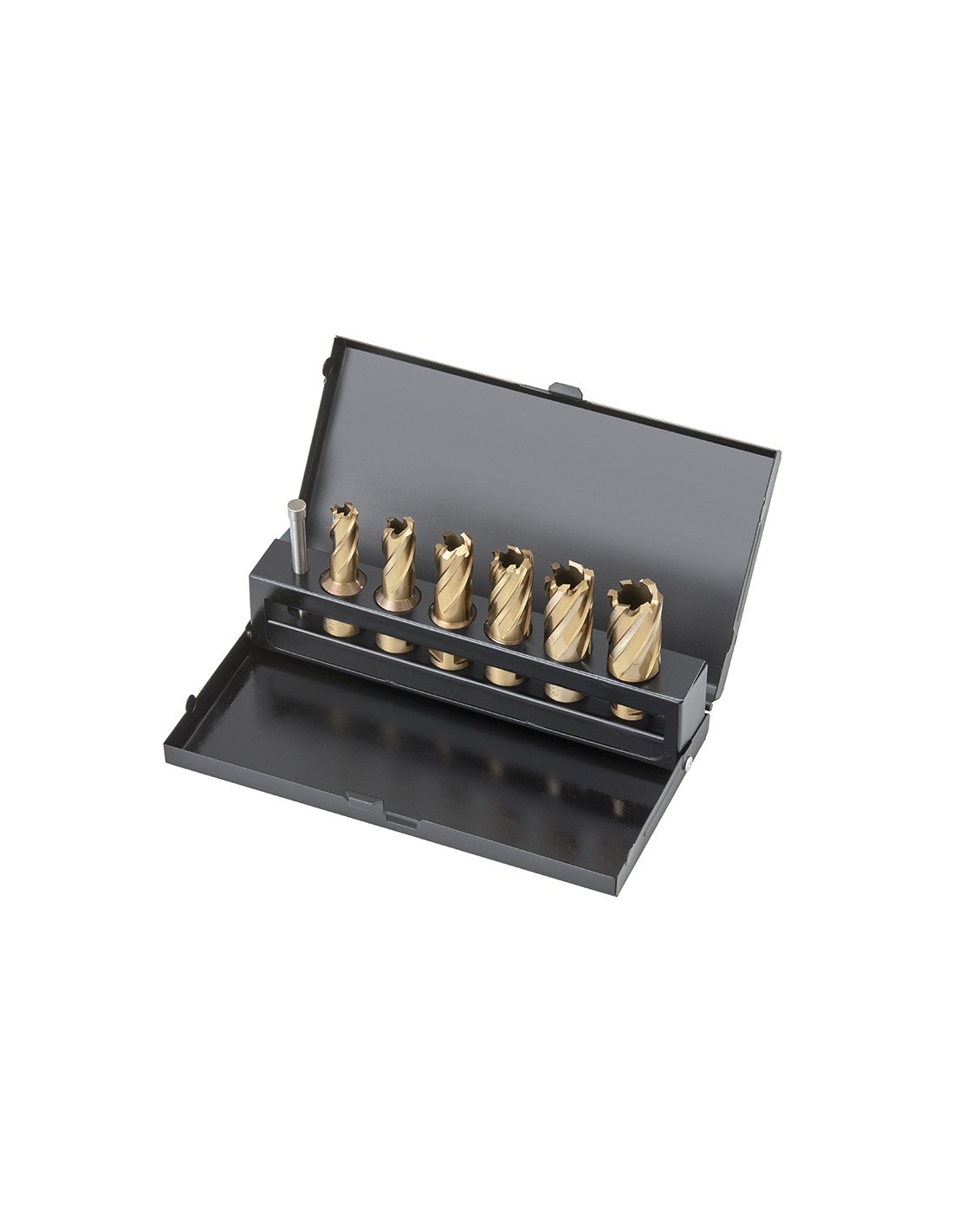 Permette un taglio molto veloce, non necessita di preforo e non crea nessuna formazione di bava grazie al minor sforzo del tagliente durante la lavorazione. Materiale di produzione acciaio super rapido A COBALTO (HSS-Co 5%). Adatte al taglio di lastre, tubi e putrelle. Profondità massima di foratura 30 mm. Gli utensili, 7 pezzi, vengono forniti in una scatola compatta e resistente.