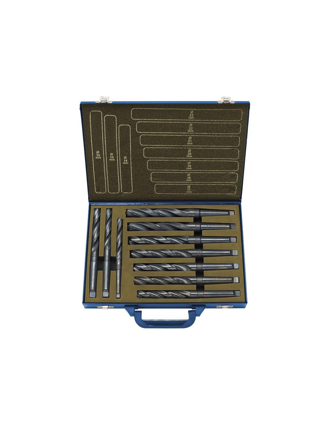 DIN 345/N, destra Materiale di produzione acciaio super rapido (HSS). L’angolo di affilatura della cima della punta è di 118°. Gli utensili, in totale 10 pezzi, vengono forniti in una valigetta compatta e resistente con maniglia ergonomica.
