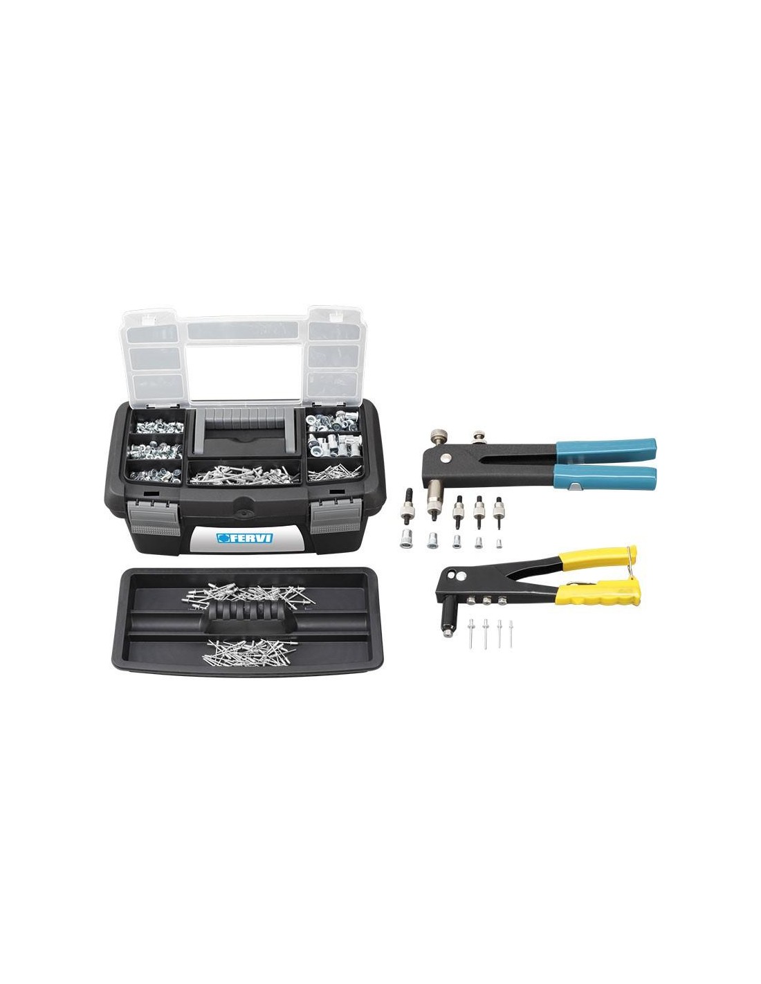rivettatrice con rivetti filettati: 50pz m3 - 50pz m4 - 25pz m5 - 25pz m6 - 20pz m8, in valigetta.