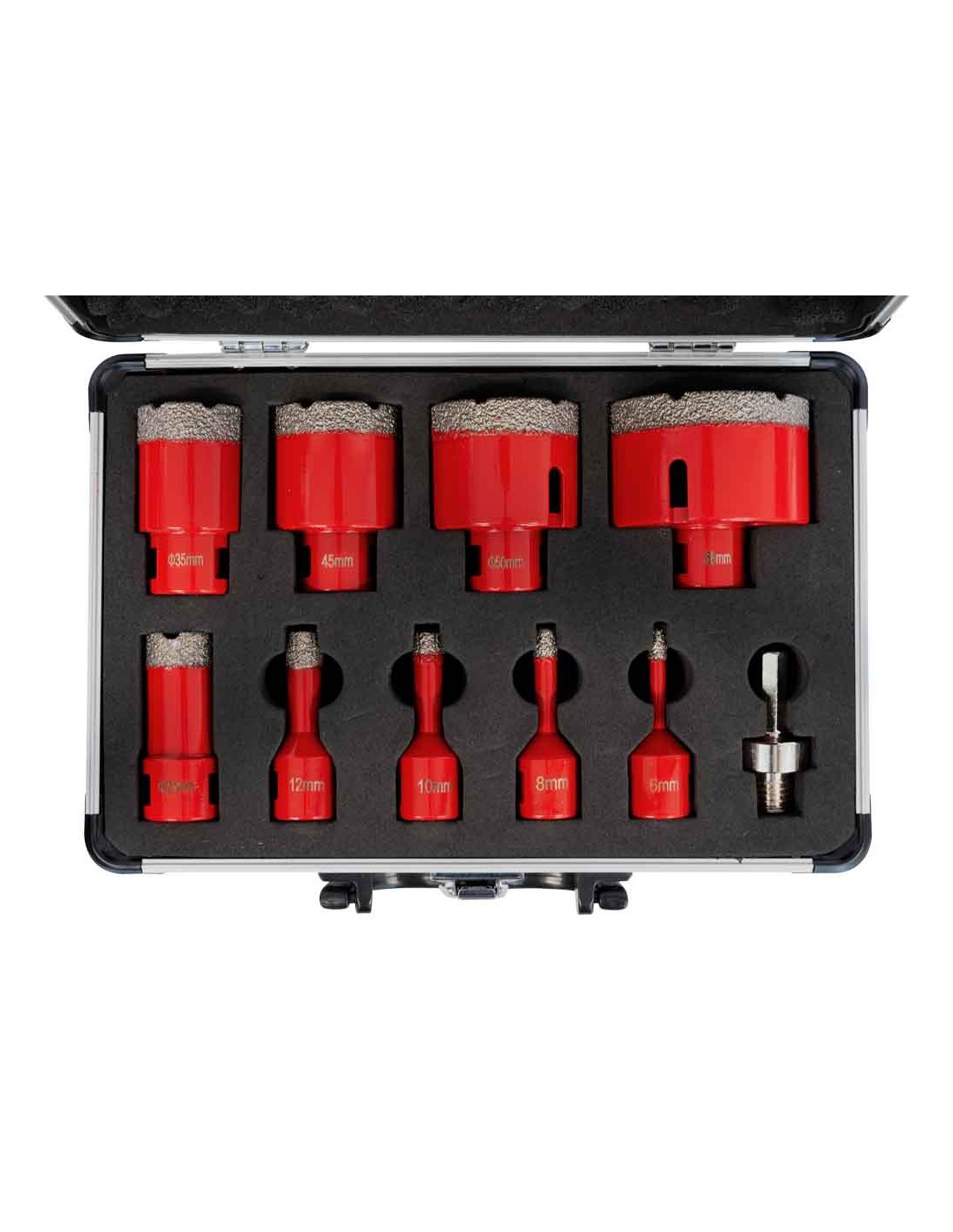 Il set di 10 corone diamantate a secco HOLZMANN è composto da 9 corone e un adattatore per mandrino quadro M14.