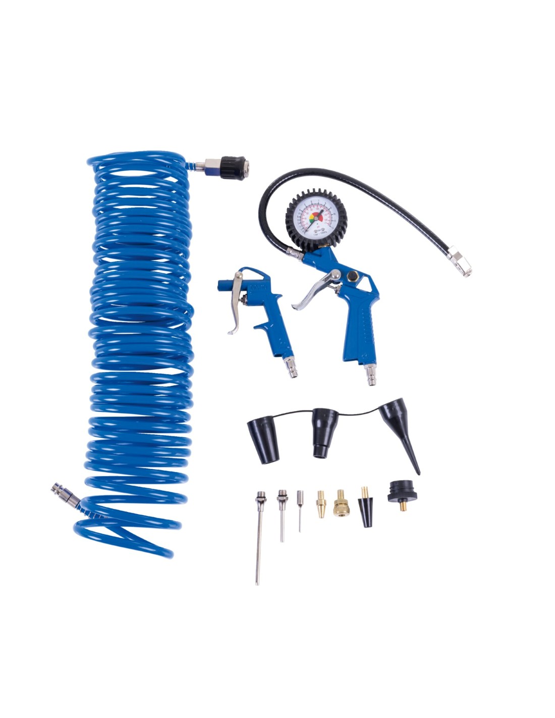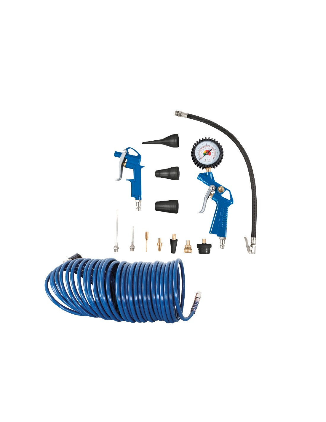 Kit di accessori per compressore della Scheppach è utilizzabile per più applicazioni: spolveratura, gonfiaggio, controllo della pressione.