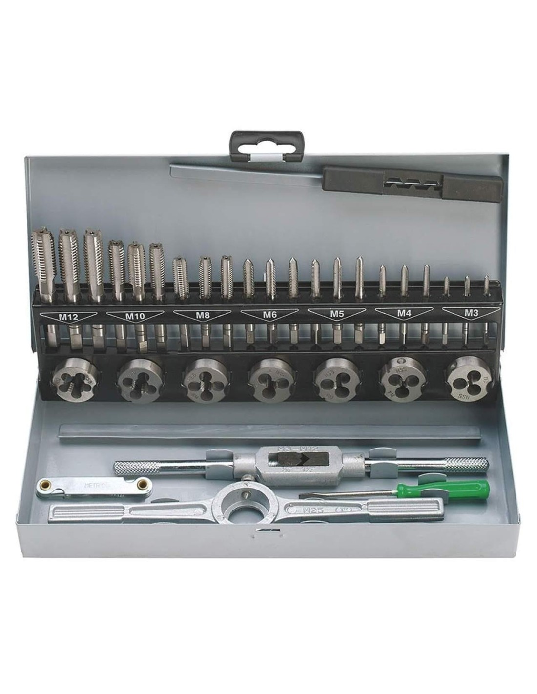 SET MASCHI E FILIERE M3-M12 FERVI M032 Serie composta da 32 pezzi HSS Giramaschio: 1 Contafiletti: 1 Girafiliera: 25 x 9 mm Giravite: 3,5 x 50 mm Maschi 3 Pz: M3x0,5 M4x0,7 M5x0,8 M6x1 M8x1,25 M10x1,5 M12x1,75 Filiere: M3x0,5 M4x0,7 M5x0,8 M6x1 M8x1,25 M10x1,5 M12x1,75