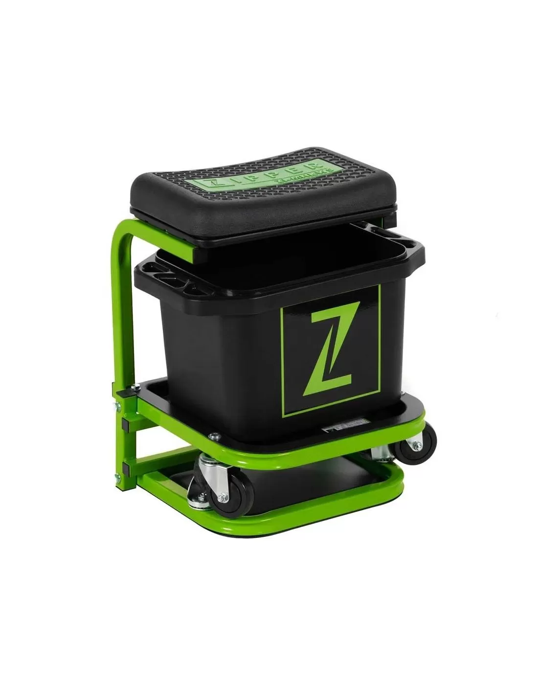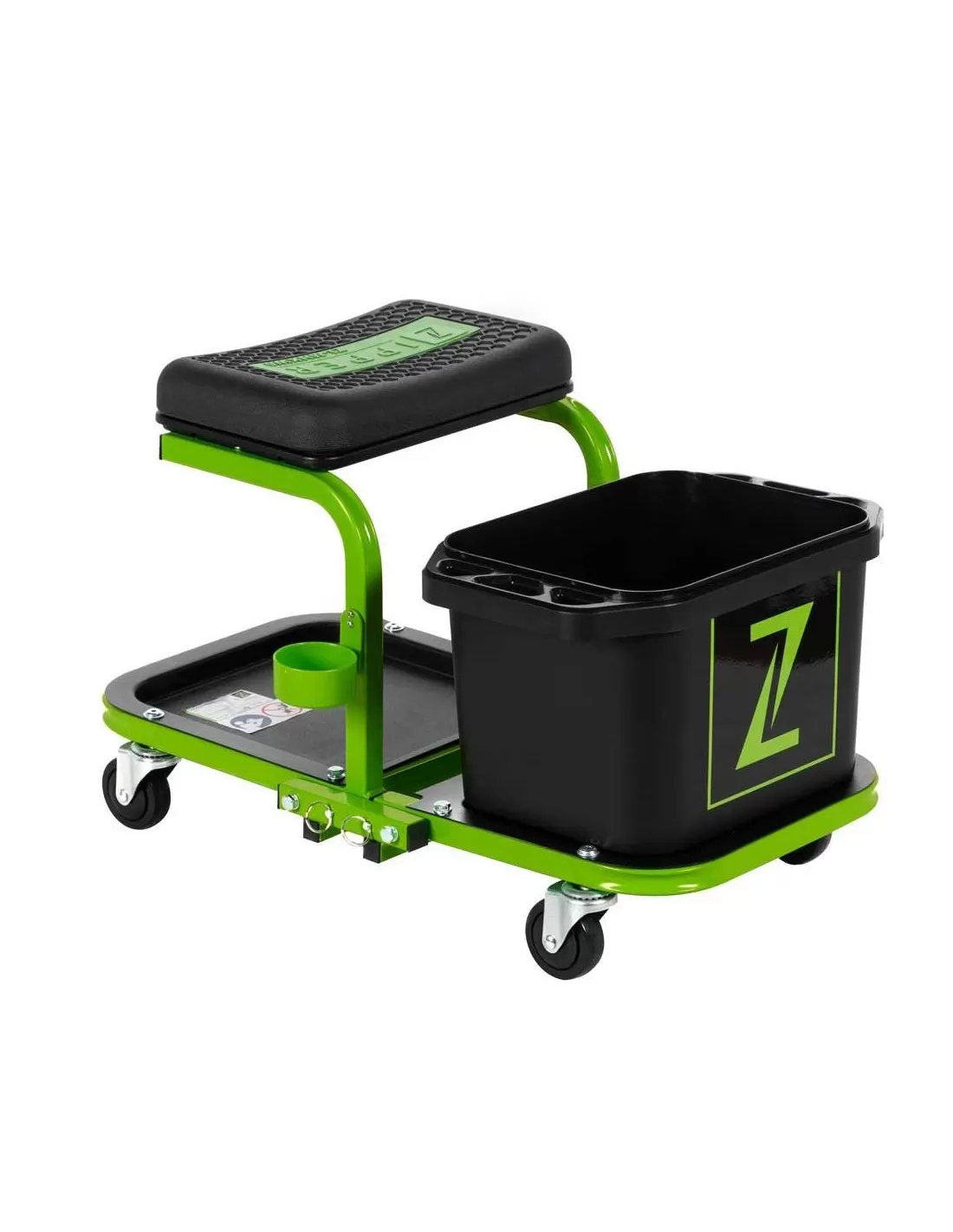 Sgabello mobile completto di vaschetta per lavaggio auto e vano portaoggetti.