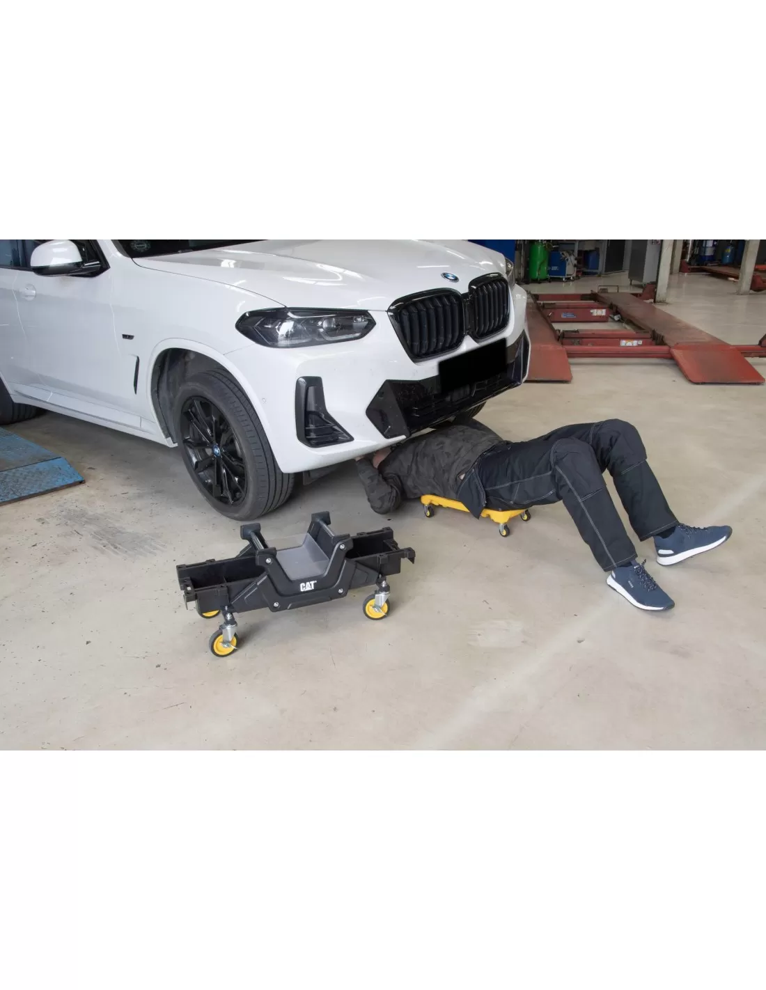 Il sedile multiuso con rotelle Cat con carrello di seduta staccabile offre una soluzione pratica per lavorare in una comoda posizione seduta per periodi prolungati. Questo sedile scorrevole 2 in 1 presenta un design robusto con telaio in acciaio e una capacità di peso di 150 kg, dotato di ruote da quattro pollici per una facile mobilità.