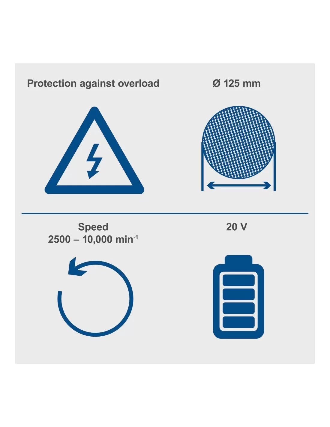 - Include 1x ruota da taglio da 125 mm, 1x chiave di montaggio a due fori, 1x impugnatura anteriore a 3 posizioni