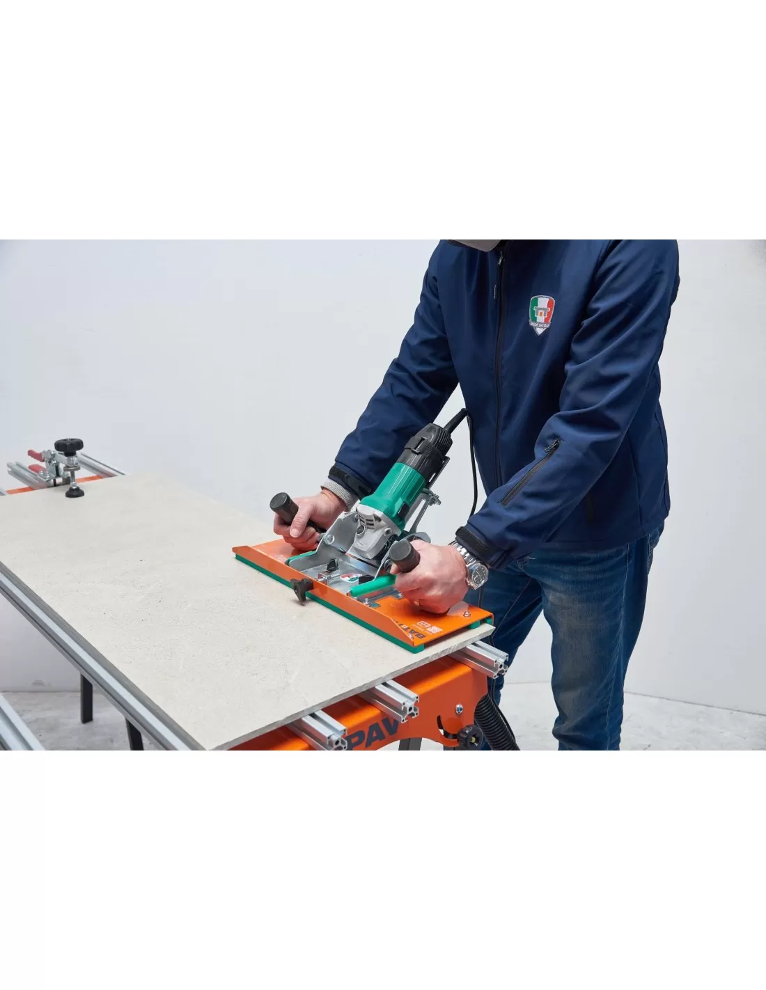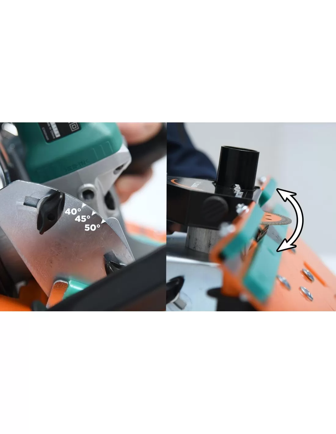 Taglio regolabile per inclinazioni da 40° a 50°. Attacco albero M14. Utilizzabile solo con dischi di diametro 115 mm.