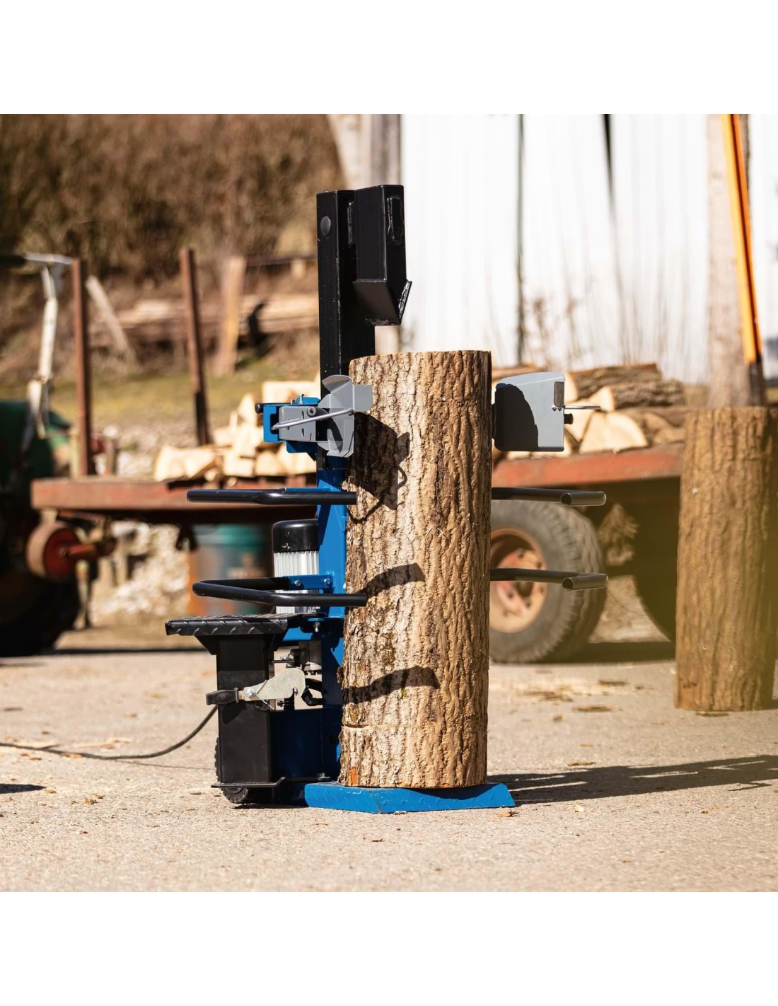 Lo spaccalegna lavora senza sforzo legno duro e tenero. La staffa di sicurezza e il funzionamento a due mani garantiscono condizioni di sicurezza ottimali.