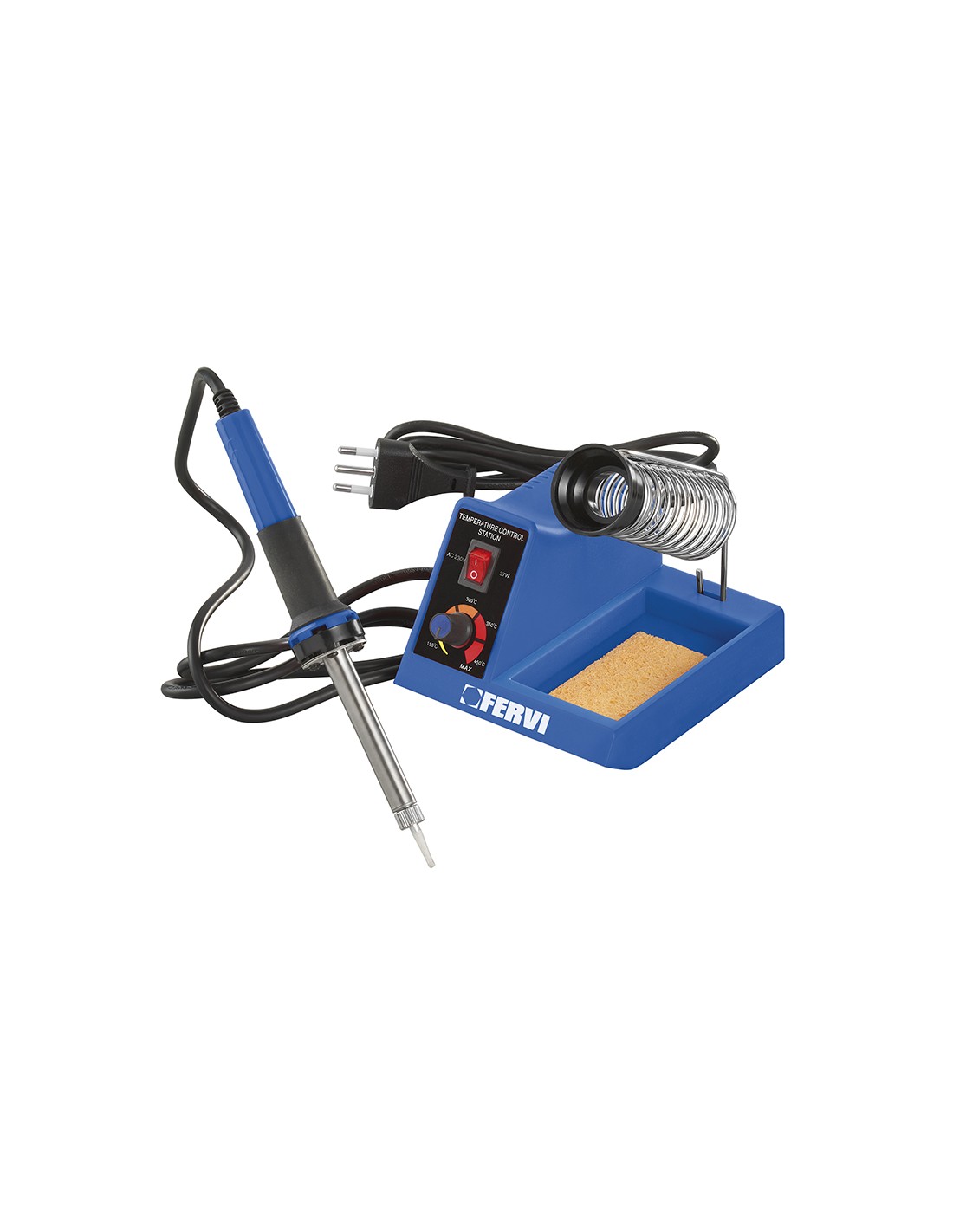 Temperatura regolabile 150°C - 420°C, punta di ferro con foro diametro 6 mm. La Stazione di saldatura a temperatura controllata è un apparecchio per la saldatura a stagno dei circuiti elettronici. Esso è dotato di un circuito di regolazione che permette all'utente di variare la temperatura della punta da 150 a 420 °C, senza bisogno di cambiare la punta o l’elemento riscaldante. La regolazione si effettua tramite la manopola sulla base e la temperatura raggiunta è indicata dall'apposita scala graduata sul contorno della stessa manopola. Le parti che compongono la stazione di saldatura oltre il corpo, che contiene i circuiti regolatori della temperatura, sono le seguenti: cavo di alimentazione, manico del saldatore, protezione del manico, punta, regolatore di temperatura, interruttore di accensione, spugna per pulizia della punta, supporto a molla del saldatore.