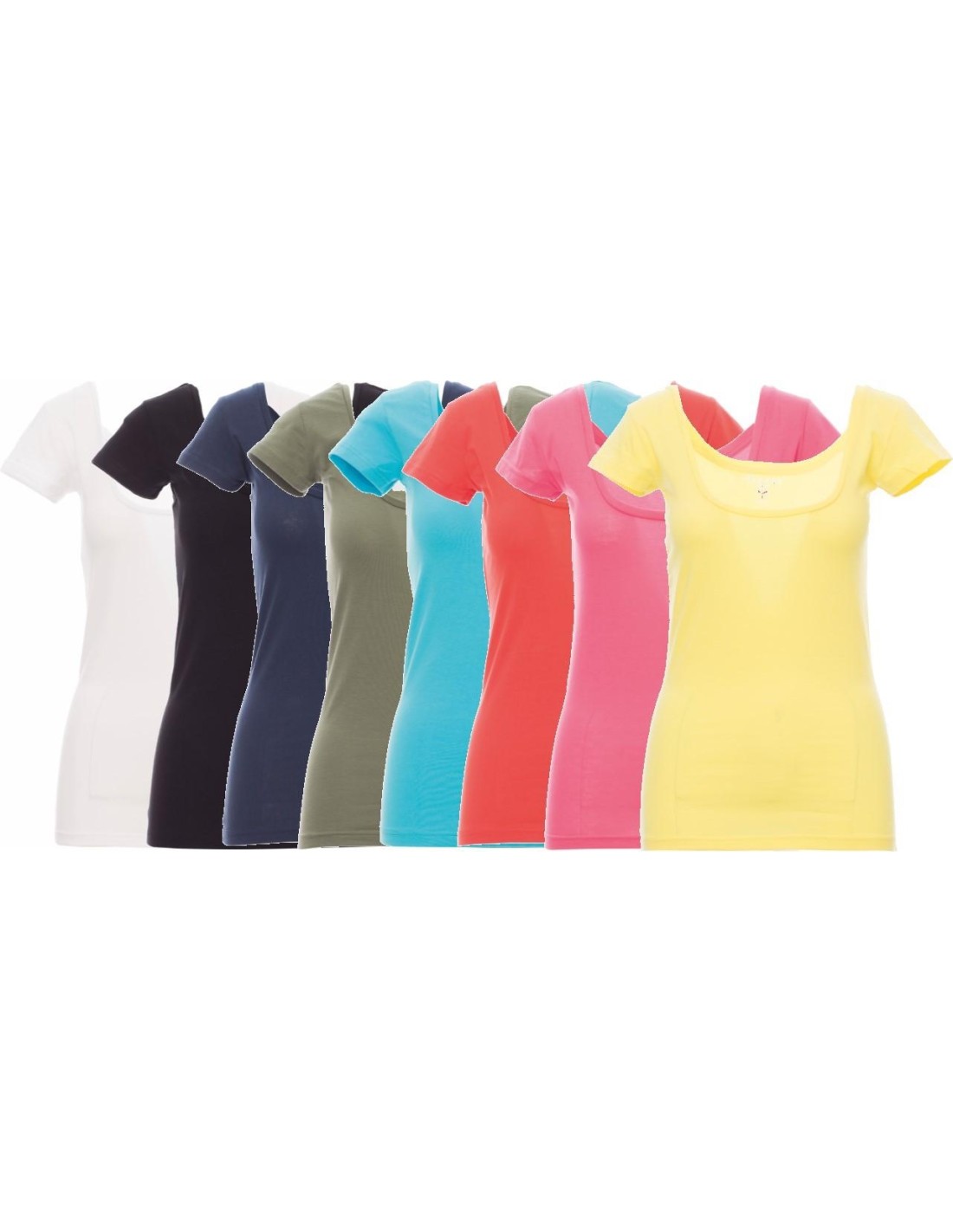 T-shirt manica corta sfiancata da donna con ampio scollo squadrato, colletto basso da 1cm, maniche corte e strette e cucitura laterale per una vestibilità più precisa.