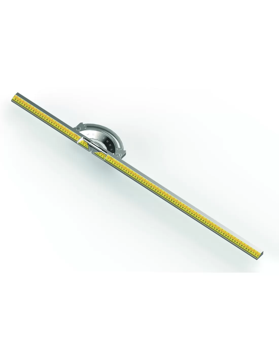 Squadra goniometrica monoblocco con lettura diretta della misura per tagli dritti e diagonali, rigida e stabile, con una forma a leggio su cui è posizionata la scala millimetrata. Taglio in diagonale, regolabile da -45° a 0 a +45°.