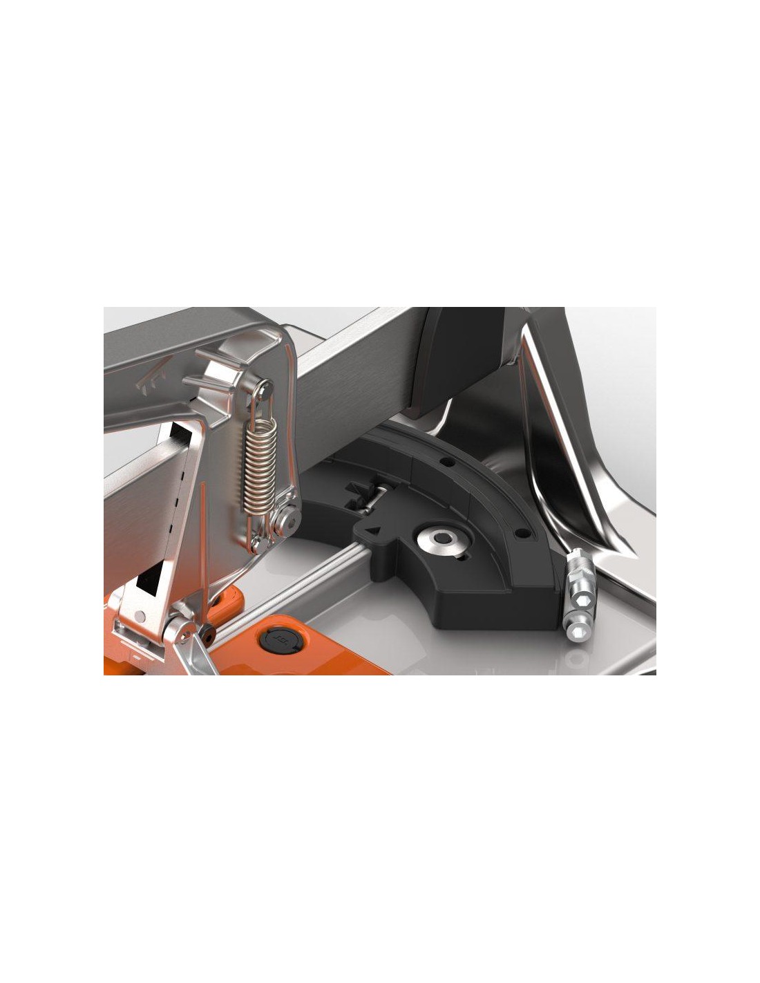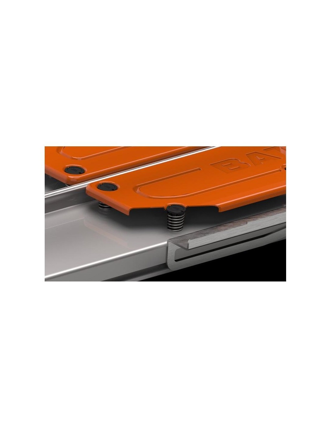 Carrello in alluminio provvisto di due cuscinetti a sfera regolabili per una perfetta scorrevolezza e massima precisione. Il carrello è dotato di Quick Start System: la presenza di molle rendono il manico sempre pronto al taglio.