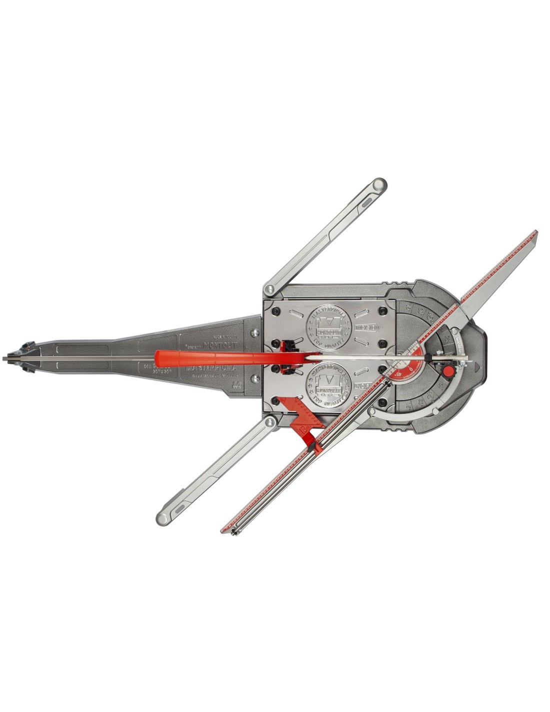 – il doppio sistema di spacco a cavalletto che, costruito in polimero antigraffio, è racchiuso in un unico componente e si può utilizzare direttamente da chiuso nei tagli usuali (senza richiedere alcun arretramento della maniglia dopo la fase di incisione) e aperto nel caso di tagli sull’angolo della piastrella o tagli di mosaico.