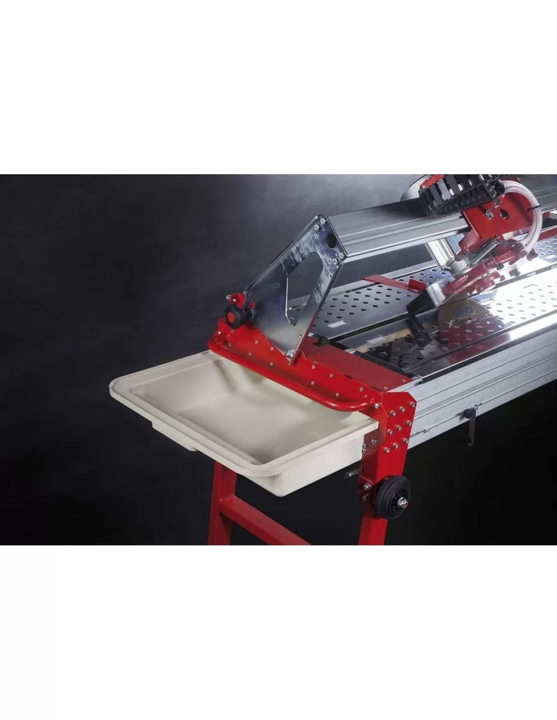 Rivoluzionario il sistema adottato per le gambe di sostegno che, come in passato, restano richiudibili, ma vedono la comparsa di due estremità telescopiche per adattare la macchina all’eventuale non planarità del terreno, evitando oscillazioni e deformazioni del telaio che possono compromettere la rettilinearità del taglio, soprattutto su lastre ceramiche o nel caso di jolly.