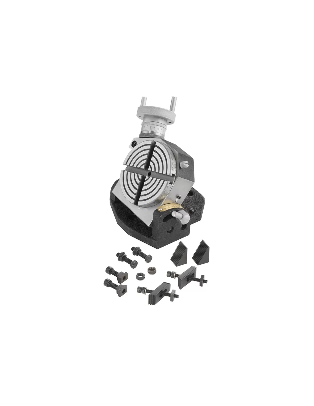Per posizionamenti precisi sia di rotazione che di inclinazione grazie alle graduazioni presenti sul volantino e leva bloccaggio inclinazione. Completo di staffe di bloccaggio.