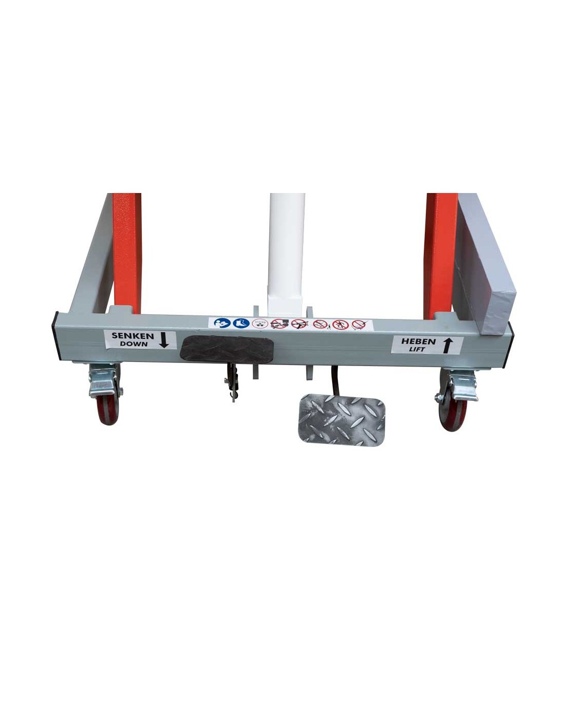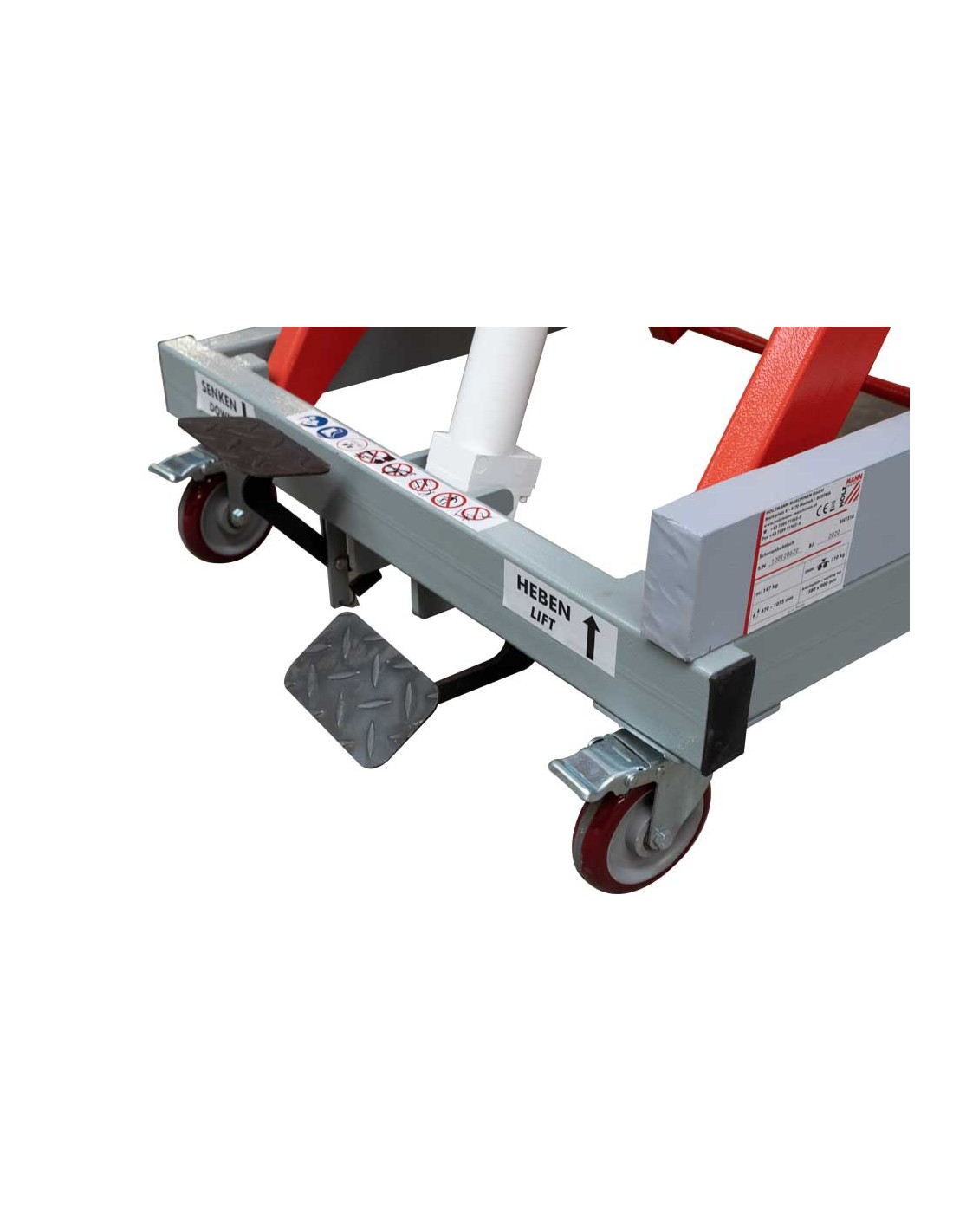 Due pedali, uno per il sollevamento idraulico e uno per l'abbassamento del tavolo di lavoro a un'altezza di lavoro ergonomica e personalizzata