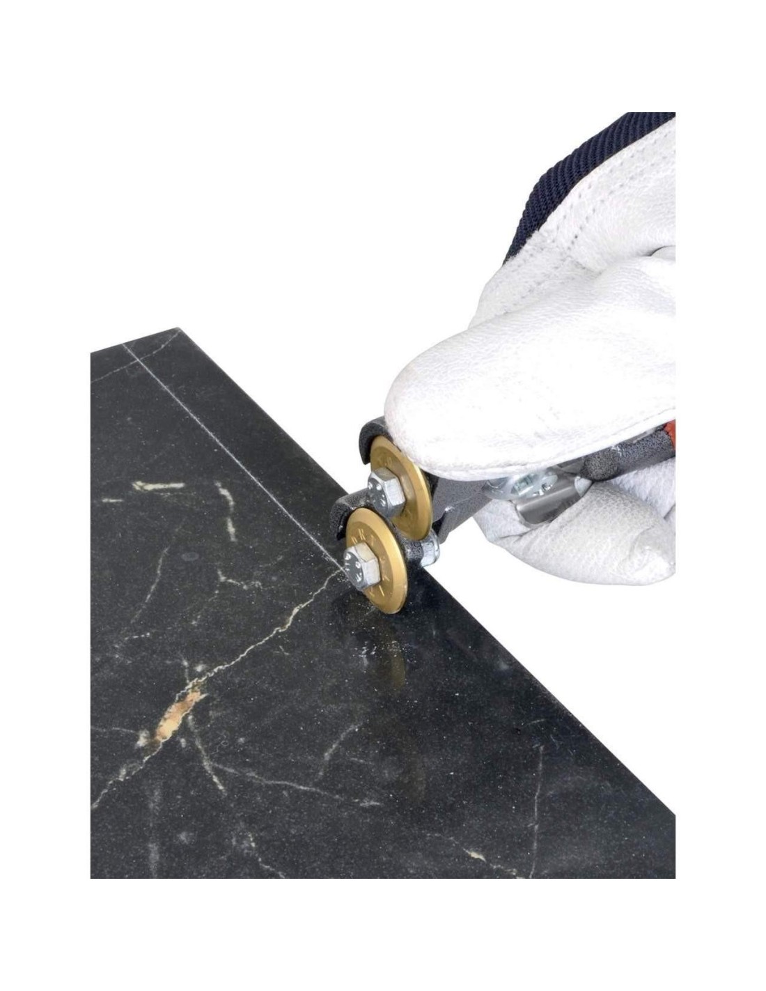 I taglienti costituiti da due speciali rotelle in carburo di tungsteno con rivestimento in Nitruro di Titanio garantiscono ottimi risultati sulle ceramiche più dure e con spessori sino a 15 mm allo stesso tempo l’estrema precisione di taglio permette anche di affrontare con disinvoltura lavorazioni accurate di finitura su materiali particolarmente delicati quali tesserine di mosaico o piastrelle in vetro.