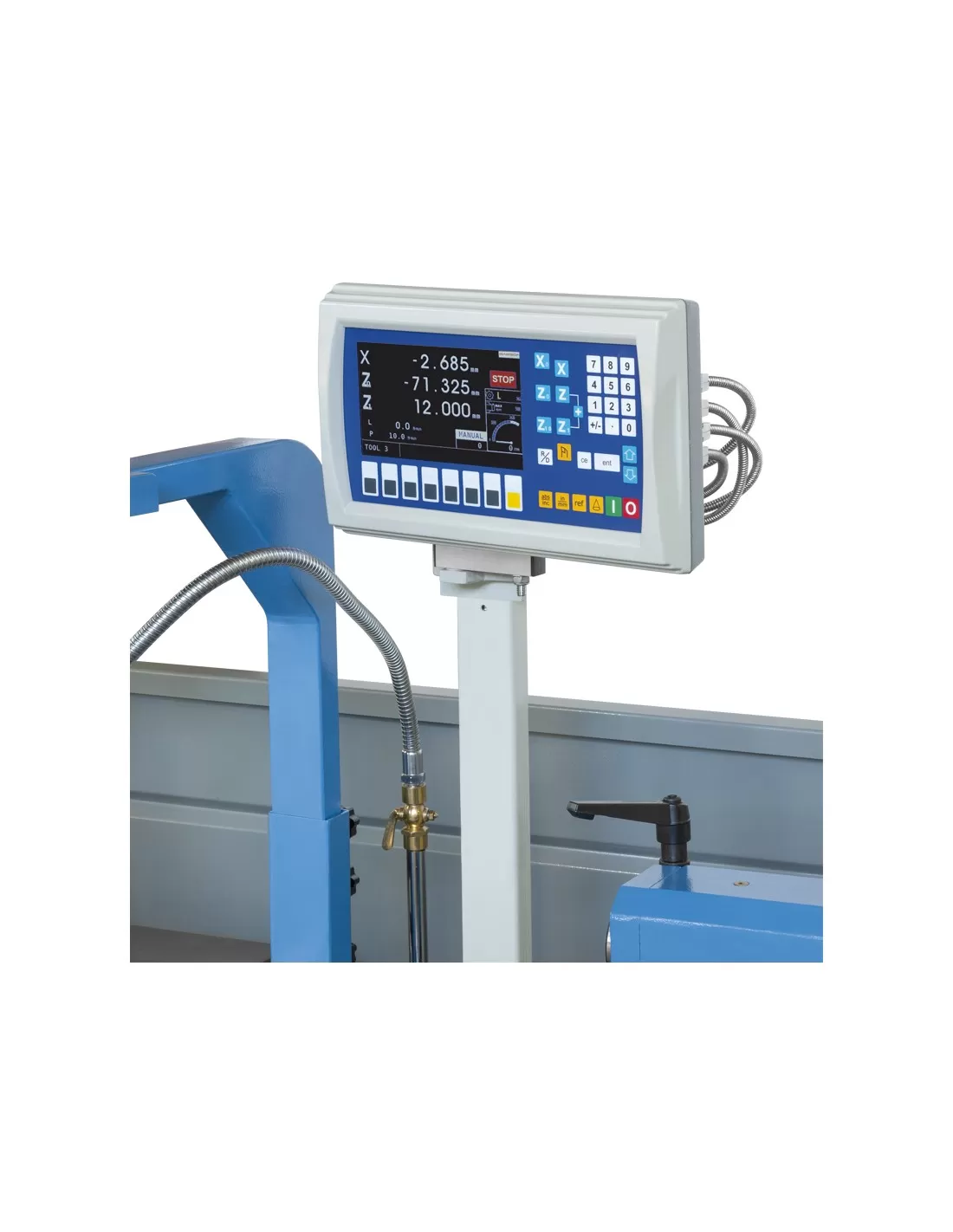 Visualizzatore a 3 assi con comando di variazione della velocità, scatola ingranaggi semi norton. Con basamento in monoblocco di ghisa. Il Visualizzatore-computer varia la velocità di rotazione in base al diametro tornito.
