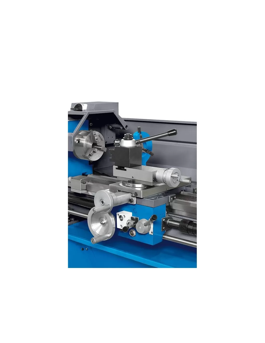 Con scatola ingranaggi semi norton, cambio velocità a cinghia, avanzamenti longitudinali, trasversali, barra di tornitura, banco parzialmente, assemblato con 3 cassetti e armadietto.