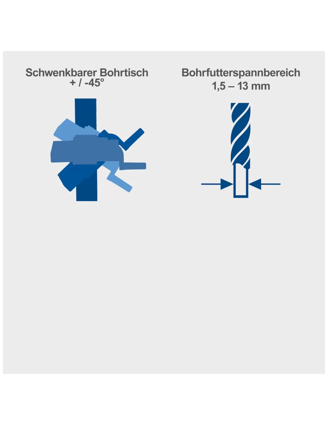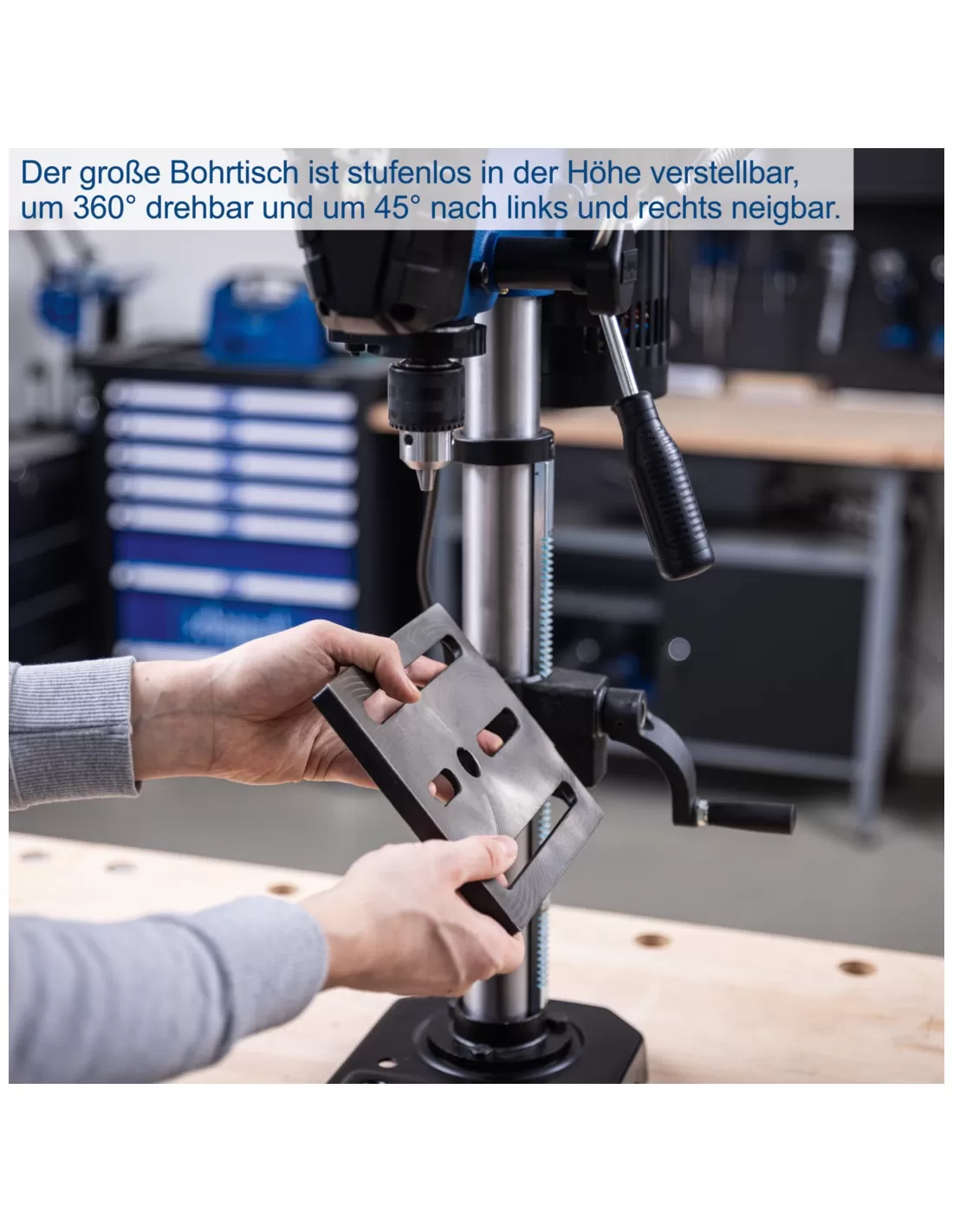 • Ampio tavolo di foratura da 194 x 165 mm, girevole a 360°, regolabile in continuo in altezza e inclinabile di +/-45°