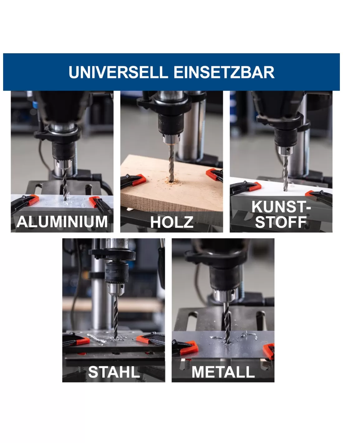 • Potente trapano da banco per forature precise su legno, metallo, alluminio o plastica