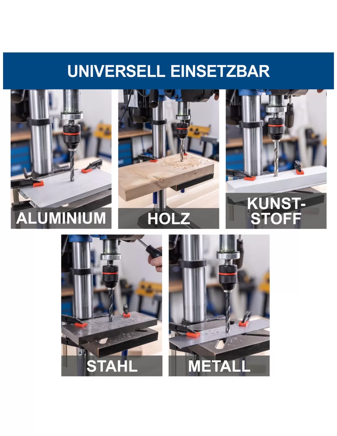 • Potente trapano da banco per forature precise su legno, metallo, alluminio o plastica
