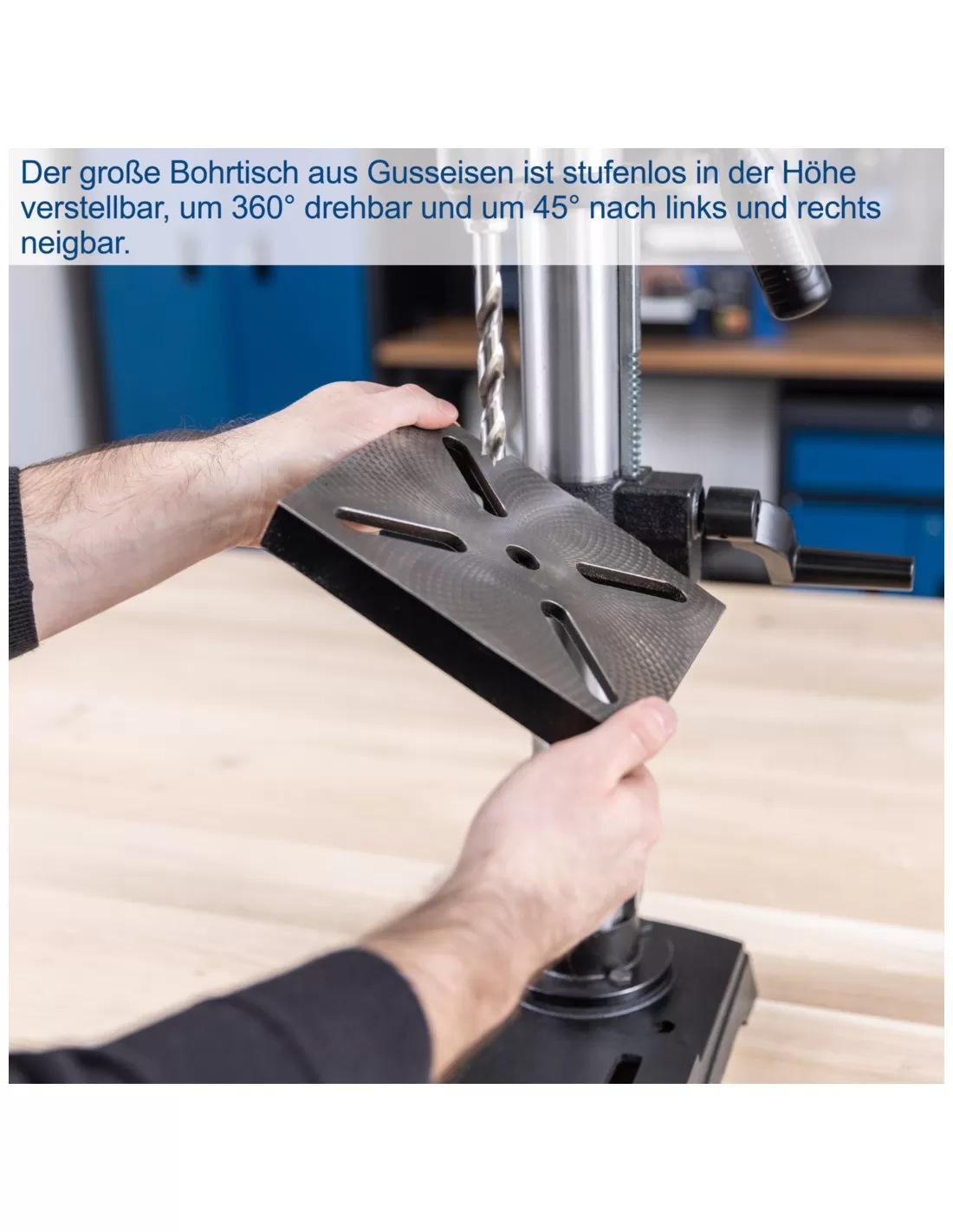 • Ampio tavolo di foratura in ghisa da 198 x 194 mm, girevole a 360°, regolabile in continuo in altezza, inclinabile di +/-45°