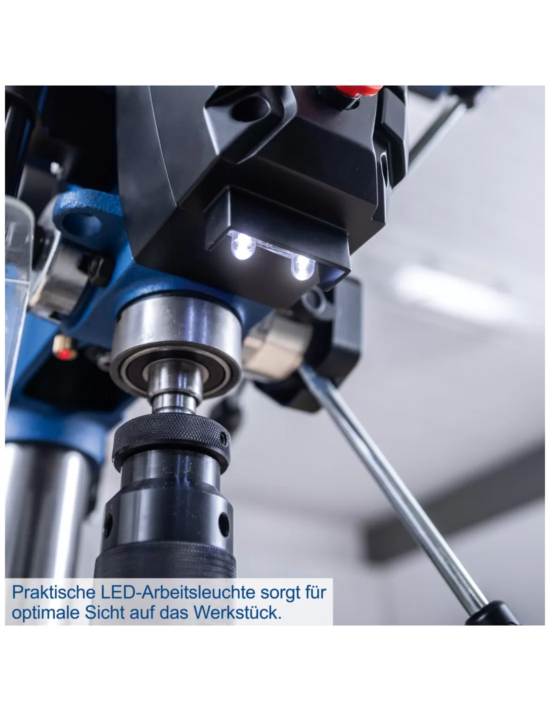 Il trapano a colonna da banco Scheppach TBM300Vario consente di forare con precisione un'ampia varietà di materiali, come legno, acciaio, metallo, alluminio o plastica. Il potente motore da 750 watt e la regolazione continua della velocità da 440 a 2580 giri al minuto garantiscono risultati ottimali. La velocità effettiva può essere visualizzata anche su un pratico display digitale. La profondità di foratura può essere regolata in continuo fino a un massimo di 80 mm. L'ampio tavolo di foratura in ghisa è regolabile in altezza in continuo, può essere ruotato di 360° e inclinato di 45° a sinistra e a destra. L'ampio sbraccio di 152 mm consente di lavorare in modo affidabile anche pezzi di grandi dimensioni. Il laser a linee incrociate integrato garantisce inoltre una foratura particolarmente precisa.