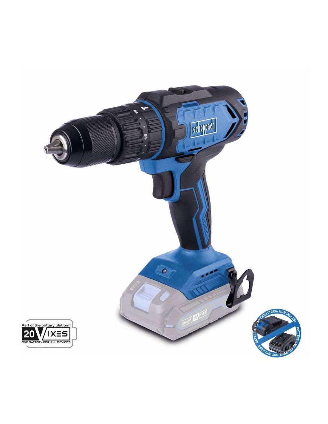 - Lavoro senza fili con la serie Scheppach IXES da 20 volt: tutte le batterie e i caricabatterie della serie di sistemi possono essere combinati con il trapano a percussione a batteria
