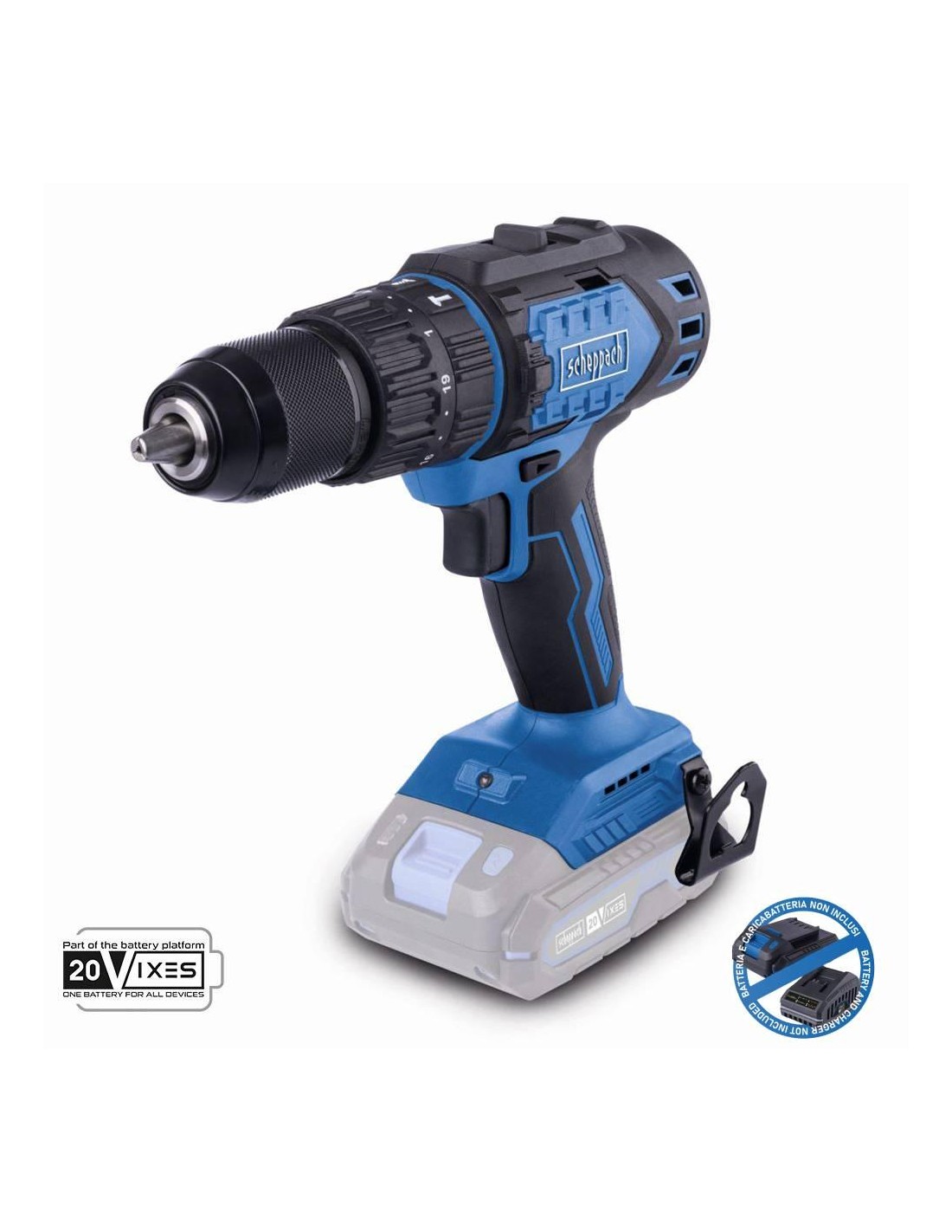 - Lavoro senza fili con la serie Scheppach IXES da 20 volt: tutte le batterie e i caricabatterie della serie di sistemi possono essere combinati con il trapano a percussione a batteria