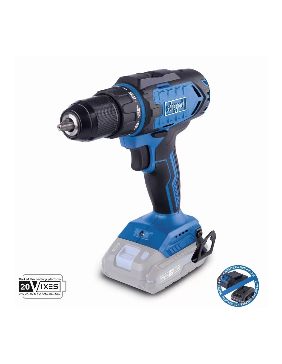 - Lavoro senza fili con la serie Scheppach IXES da 20 volt: tutte le batterie e i caricabatterie della serie di sistemi possono essere combinati con il trapano a batteria