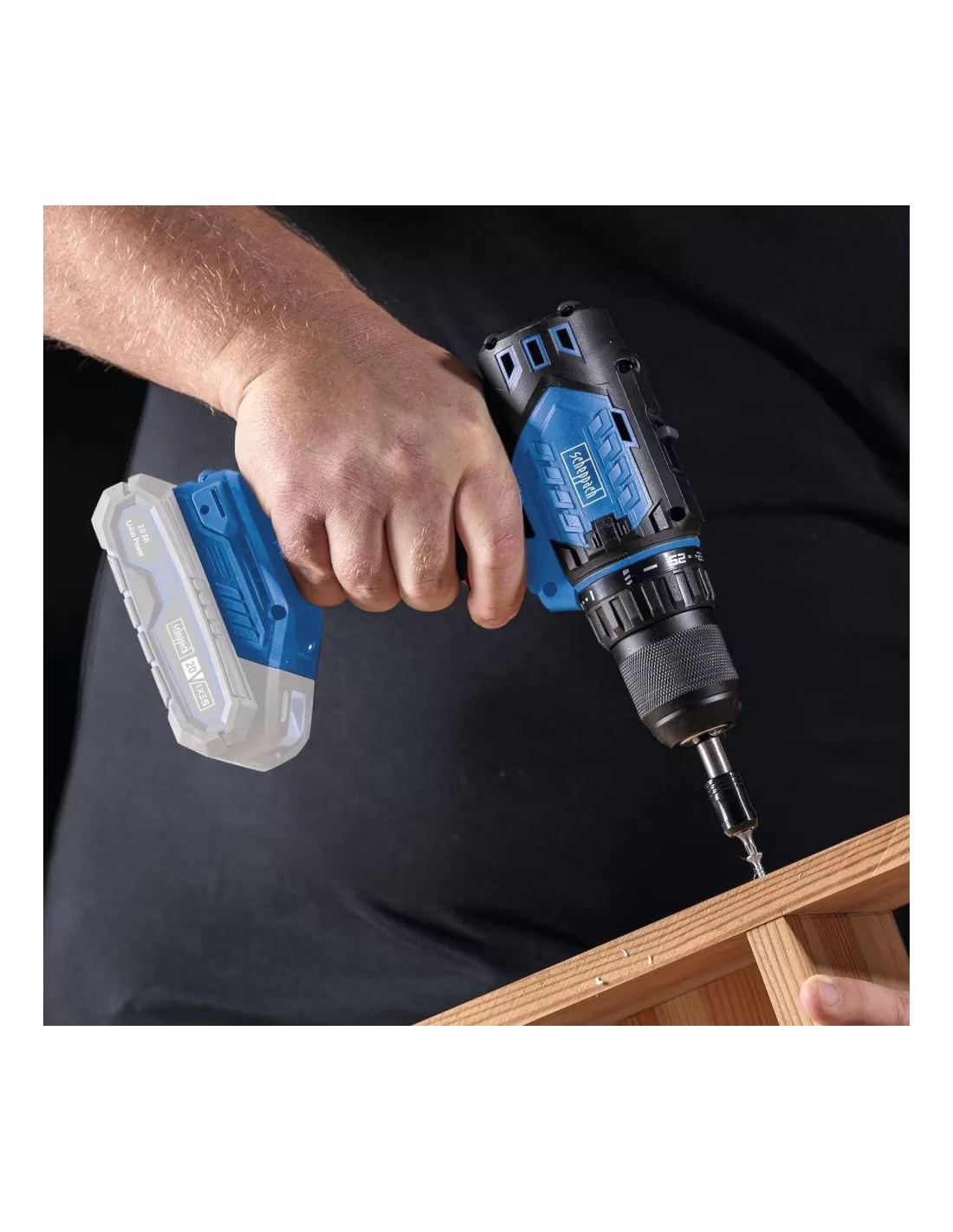 - Lavoro senza fili con la serie Scheppach IXES da 20 volt: tutte le batterie e i caricabatterie della serie possono essere combinati con il trapano a batteria
