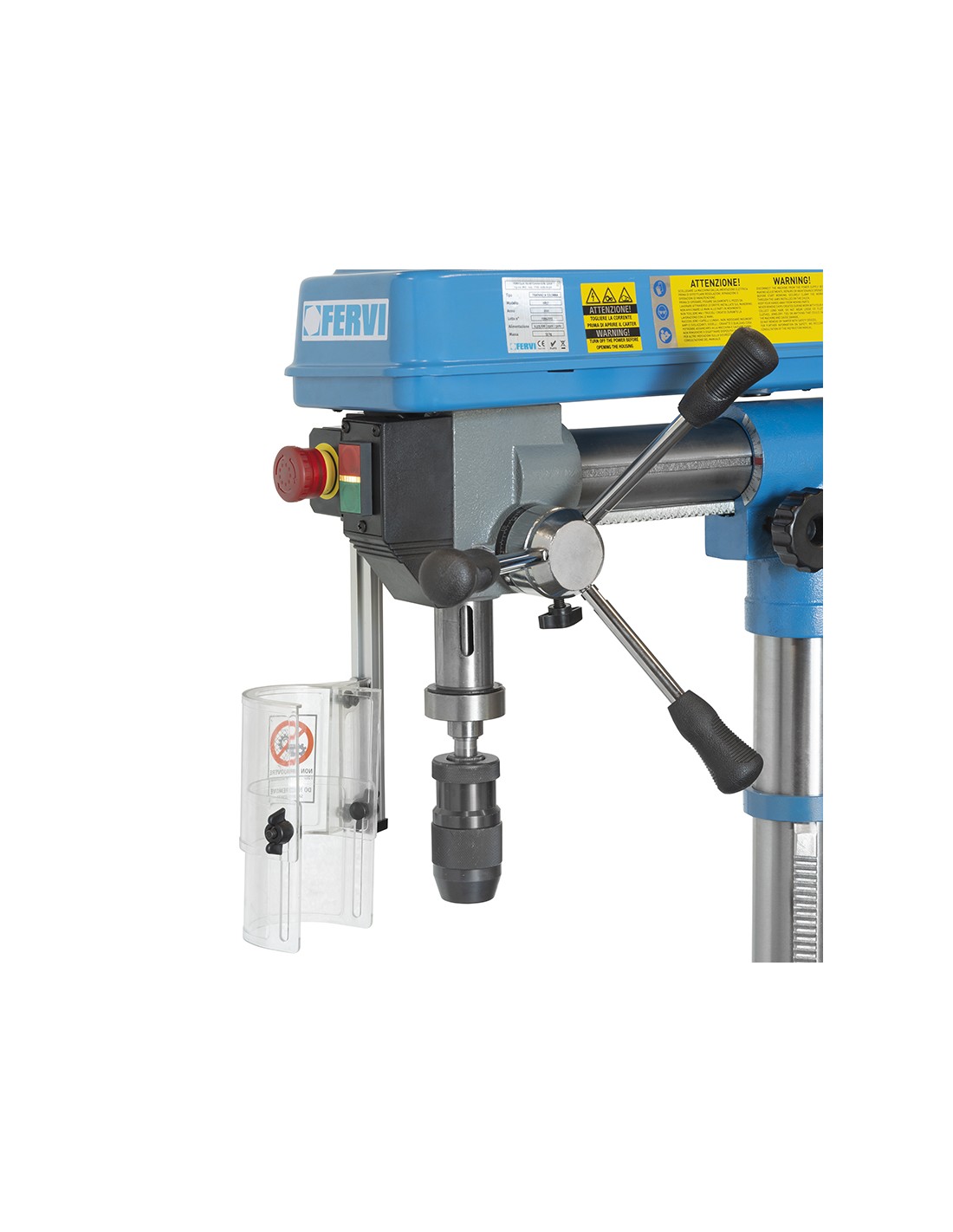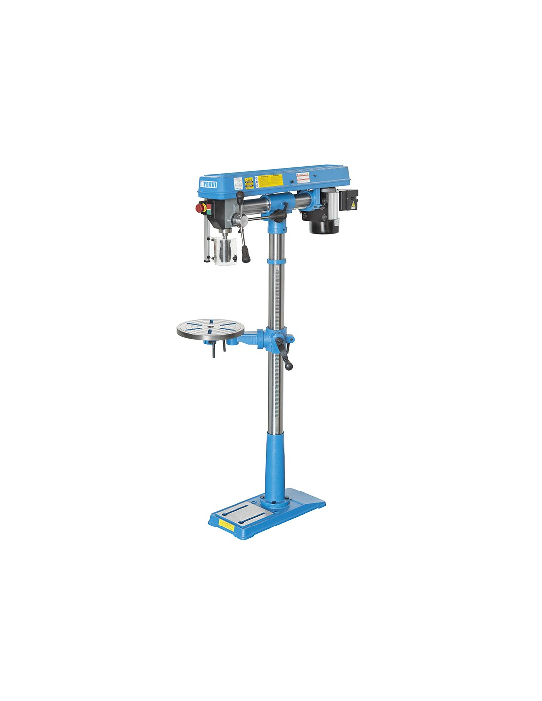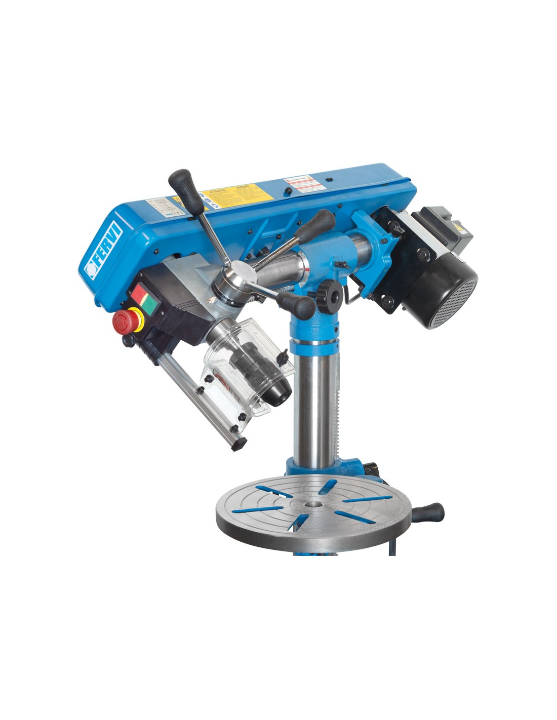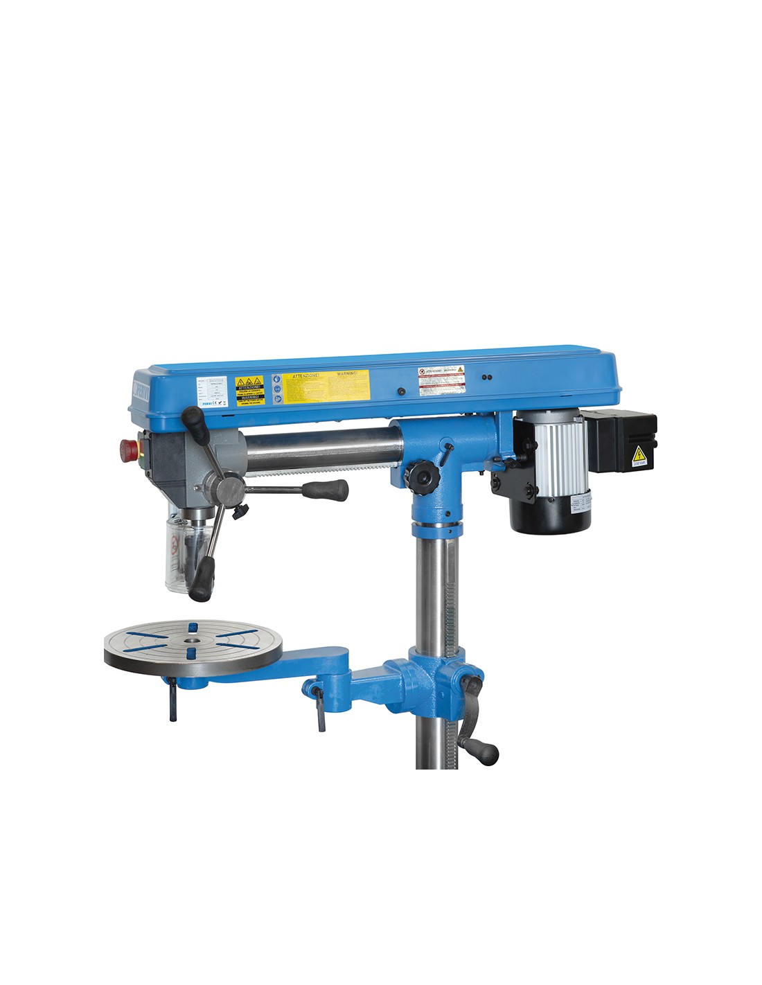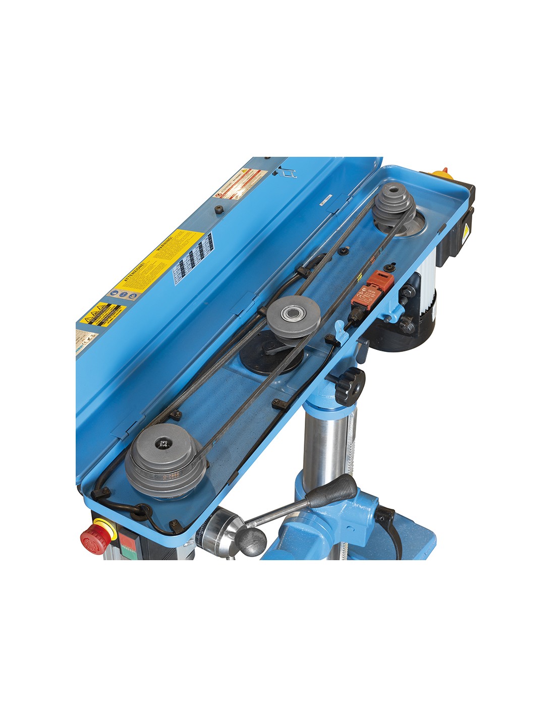 Tavola girevole e inclinabile con doppio braccio, testa inclinabile, impianto elettrico con circuito separato a 24V per i comandi bordo macchina. Il Trapano a colonna con trasmissione a cinghia è progettato per eseguire semplici operazioni meccaniche tra cui la foratura, l’alesatura e la lamatura di vari oggetti ed utensili. La macchina è in grado di eseguire lavorazioni su materiali differenti, variando l’utensile in funzione delle operazioni da eseguire e del materiale di cui è costituito il pezzo da lavorare. La macchina prevede 10 differenti velocità di rotazione del mandrino. Il motore gira a velocità costante e la macchina è dotata di un apposito sistema di trasmissione a cinghie per la variazione della velocità. Quest’ultima può essere impostata spostando le cinghie sulle gole delle pulegge del sistema di trasmissione. L’avanzamento dell’utensile è manuale. La macchina è composta dalle seguenti componenti principali: pulsanti di comando, protezione mandrino, tavola di lavoro, base trapano, protezione del vano pulegge, motore elettrico, volantino del mandrino, mandrino, cremagliera, manovella regolazione tavola e leva di bloccaggio della tavola.