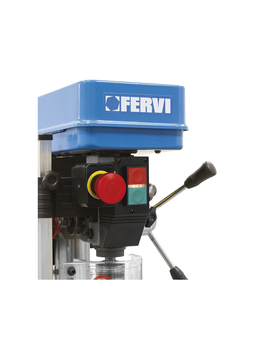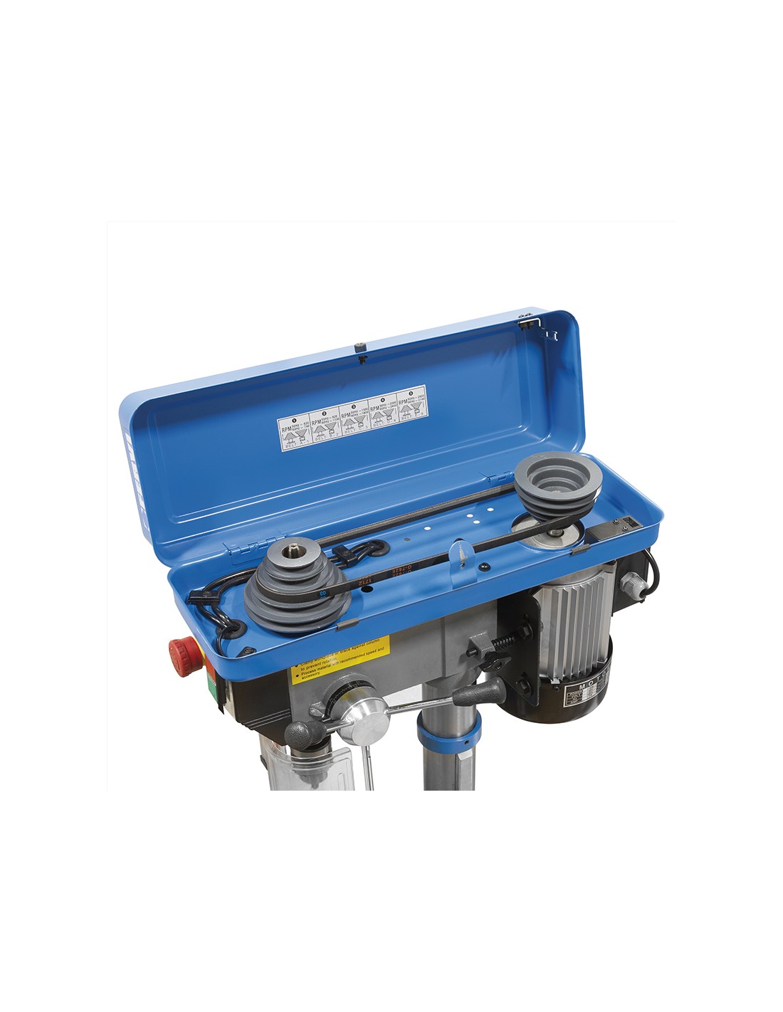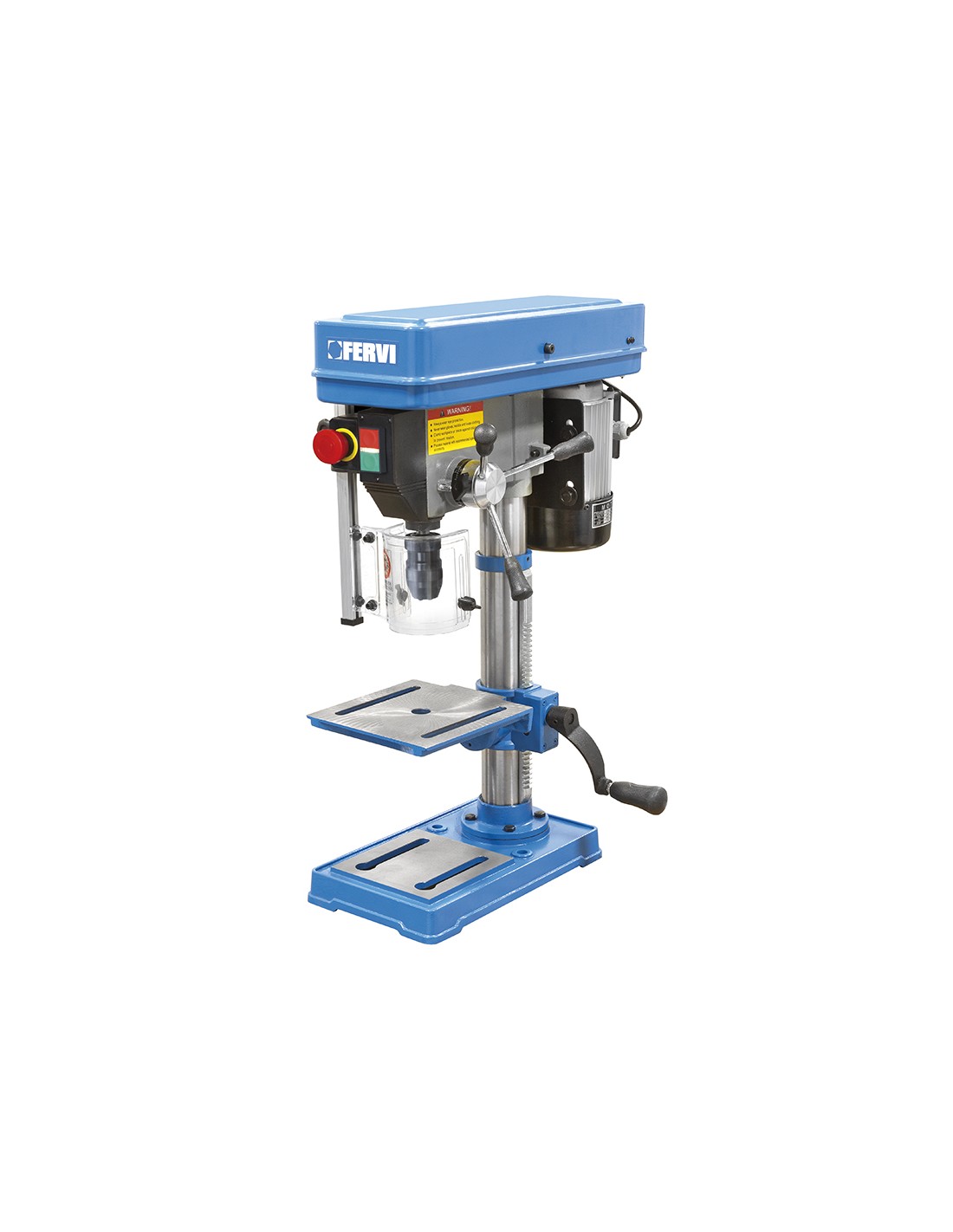 Spostamento verticale a cremagliera della tavola, tavola inclinabile. Impianto elettrico con circuito separato a 24V per i comandi bordo macchina. Il Trapano da banco con trasmissione a cinghia è progettato per eseguire alcune semplici operazioni meccaniche tra cui la foratura, l’alesatura e la lamatura di vari oggetti ed utensili. La macchina è stata realizzata per eseguire tali lavorazioni su materiali differenti, variando l’utensile in funzione delle operazioni da eseguire e del materiale di cui è costituito il pezzo da lavorare. La macchina prevede 5 differenti velocità di rotazione del mandrino. Il motore gira a velocità costante e la macchina è dotata di un apposito sistema di trasmissione a cinghie per la variazione della velocità del mandrino. Quest’ultima può essere impostata spostando le cinghie sulle gole delle pulegge del sistema di trasmissione. L’avanzamento dell’utensile è manuale. La macchina è composta dalle seguenti componenti: comandi, protezione mandrino, tavola di lavoro, base trapano, coperchio protezione cinghie, motore elettrico, volantino spostamento mandrino, mandrino, manovella regolazione tavola, leva di bloccaggio tavola.