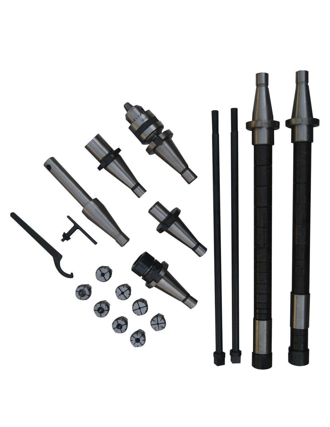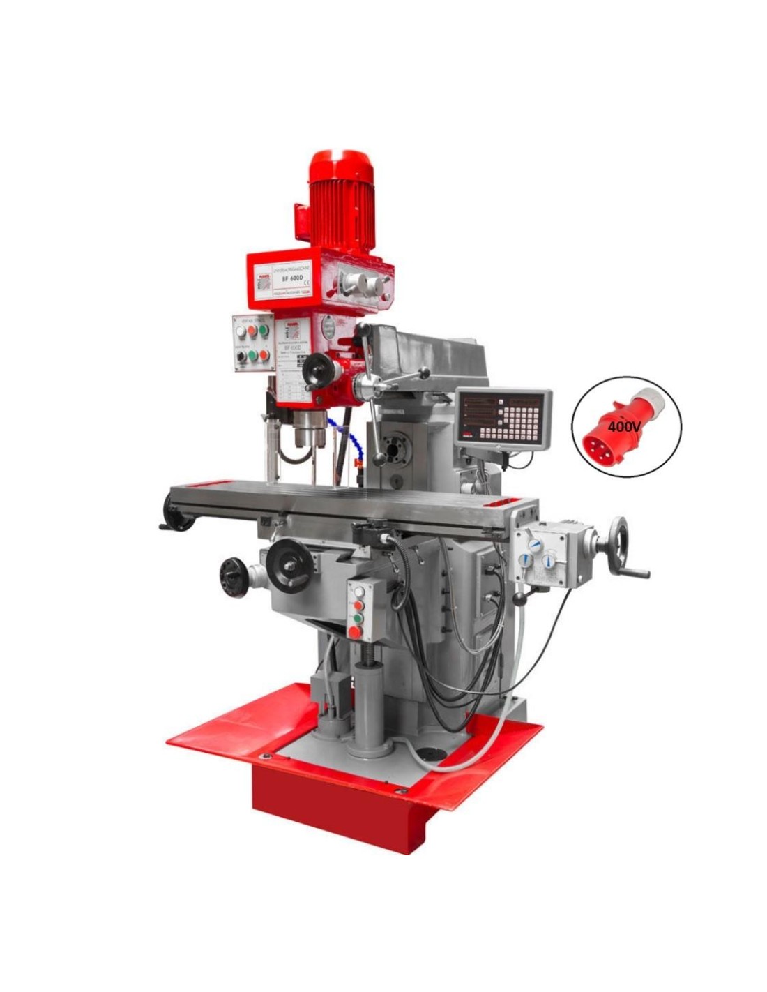 Incluso: Visualizzatore con display digitale sui 3 assi, impianto ri refrigerazione, lampada alogena, mandrino 3-16mm (B16), adattatori (4,5,6,8,10,14,12,16mm), riduzione ISO 40-CM3, ISO 40 -CM2, ISO 40-B18, albero portafrese 22 e 27mm, morsa professionale 160mm, asta di trazione M16.