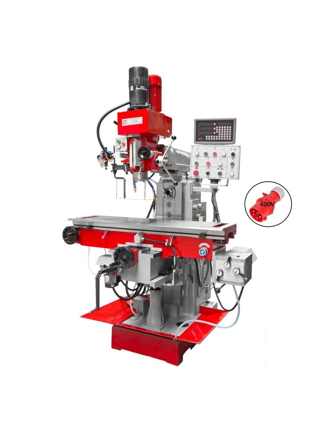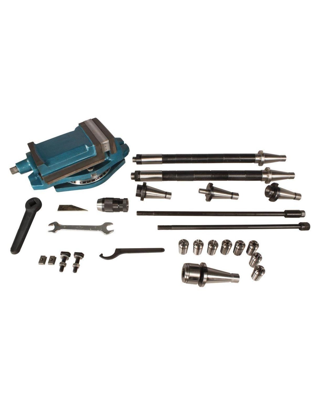 Incluso: Visualizzatore con display digitale sui 3 assi, impianto ri refrigerazione, lampada alogena, mandrino autoserrante B18 / 1-16MM, adattatori (4,5,6,8,10,14,12,16mm), riduzione ISO 40-CM3, ISO 40 -CM2, ISO 40-B18, morsa professionale 160mm, pompa dell'olio, sistema di lubrificazione, albero portafrese 22 e 27mm.