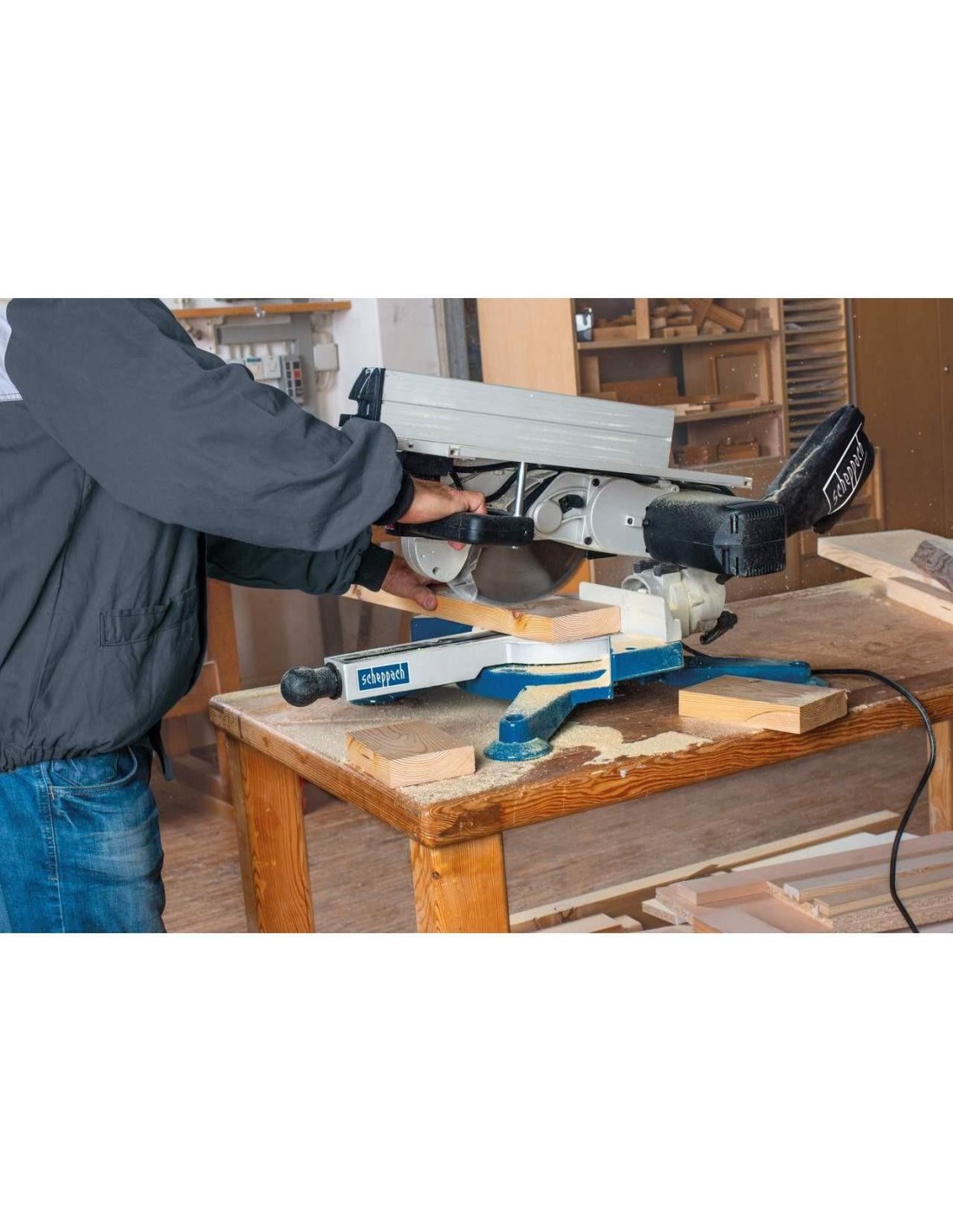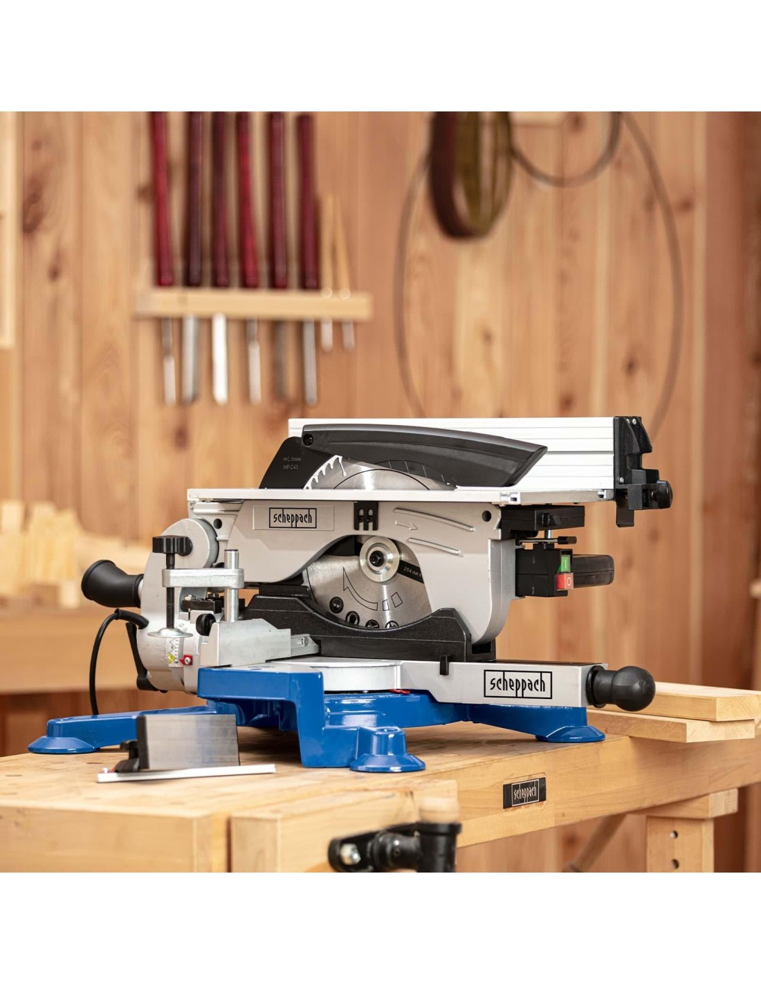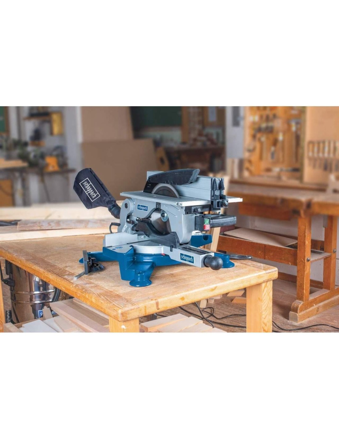 Scheppach HM100T combina in una sola macchina una troncatrice ed una sega da banco. Ciò consente di risparmiare molto spazio in una piccola officina.