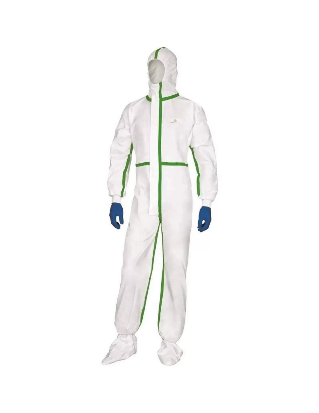 Tuta con cappuccio elasticizzata. Deltatek® 5000 non tessuto microporoso laminato. Chiusura zip doppio cursore sotto baverina autoadesiva.