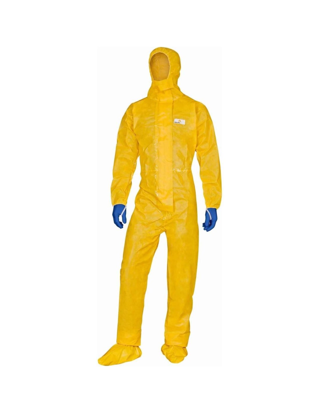 Tuta con cappuccio elasticizzato a 3 strati. Deltachem® non tessuto. Chiusura zip sotto doppia baverina. Doppio elastico fondo manica per pollice.